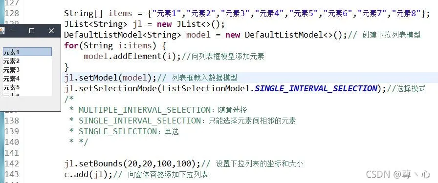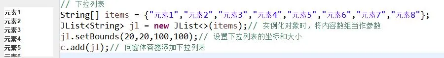 JList组件——列表框。它有两种方式被创建出来,实际上也就跟上面JComBox的第一二种方法一样,一个实例化时参数中放进内容数组,一个创建列表数据模型,稍微不一样的是数据模型。