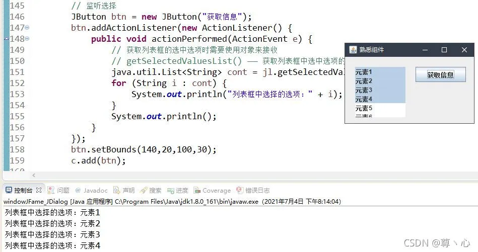 说了接收数据,那么怎么获取数据?列表框的组件提供了getSelectedValuesList()方法,用JList组件调用这个方法就可以获取到选中内容的值;该方法返回的是数组,所以使用List类接收