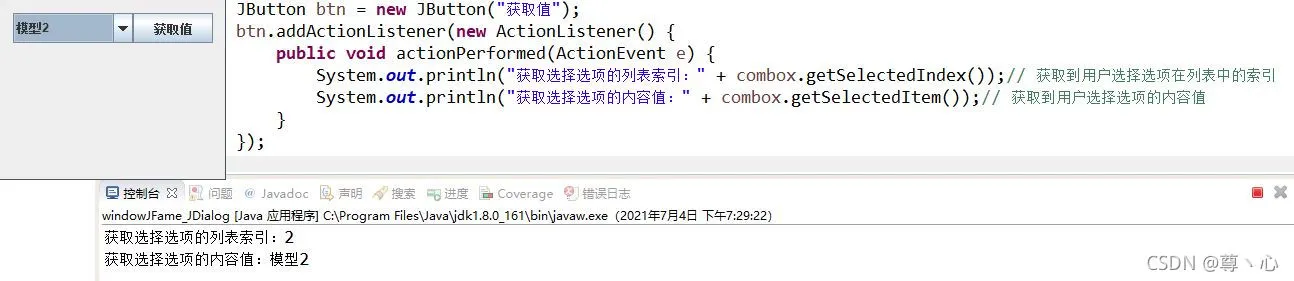 在选中下拉框后,点击JButton按钮,将两个值输出出来。如图: