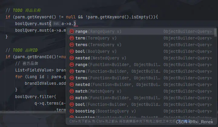 // 遍历品牌 List<FieldValue> brandIdValues = new ArrayList<>(); for (Long id : parm.getBrandId()) { // 注意:这里 Long类型需要转化为 FieldValue 类型 brandIdValues.add(FieldValue.of(id)); } boolQuery.filter( q->q.terms(a->a.field("brandId") .terms(b->b.value(brandIdValues)) ) );