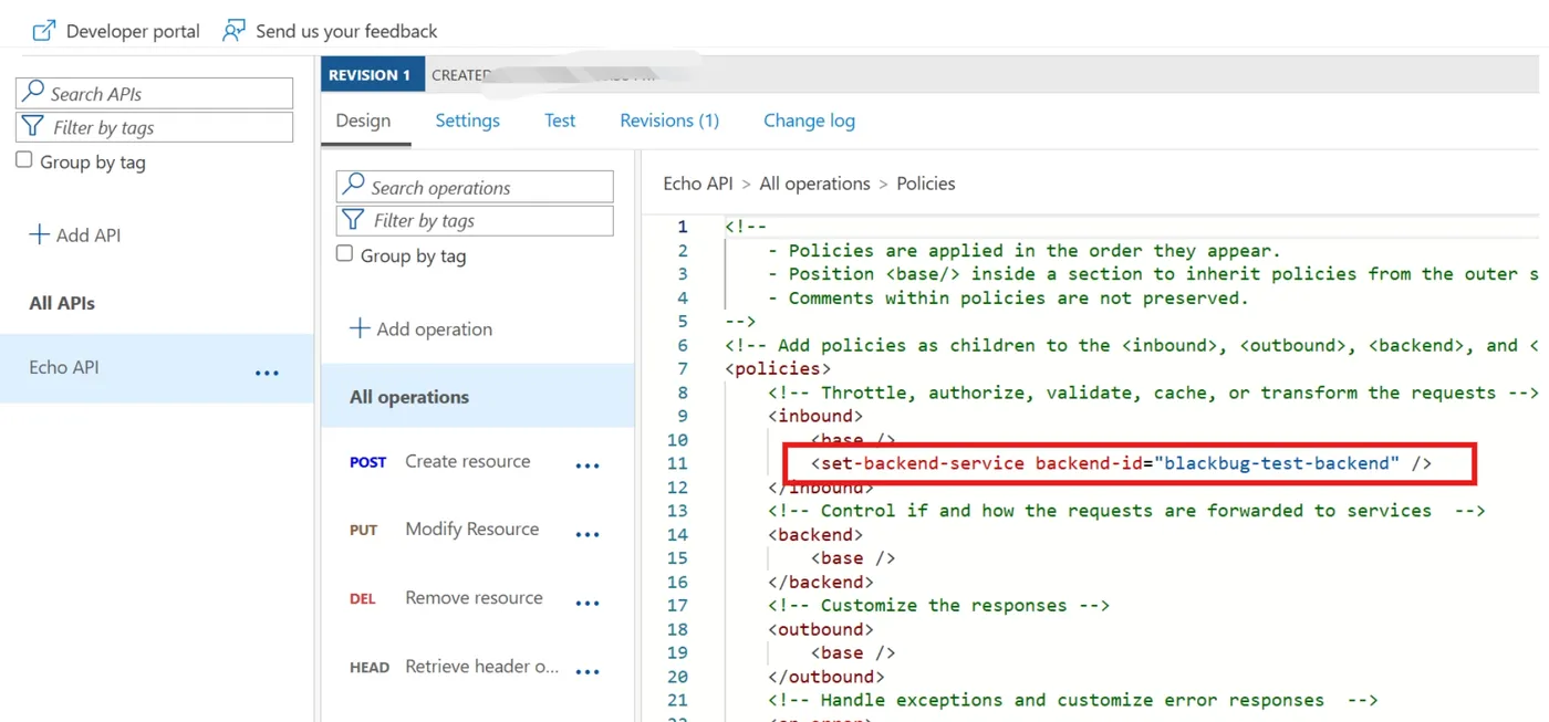 而在API配置中,则是通过 set-backend-service policy来使用这个backend。