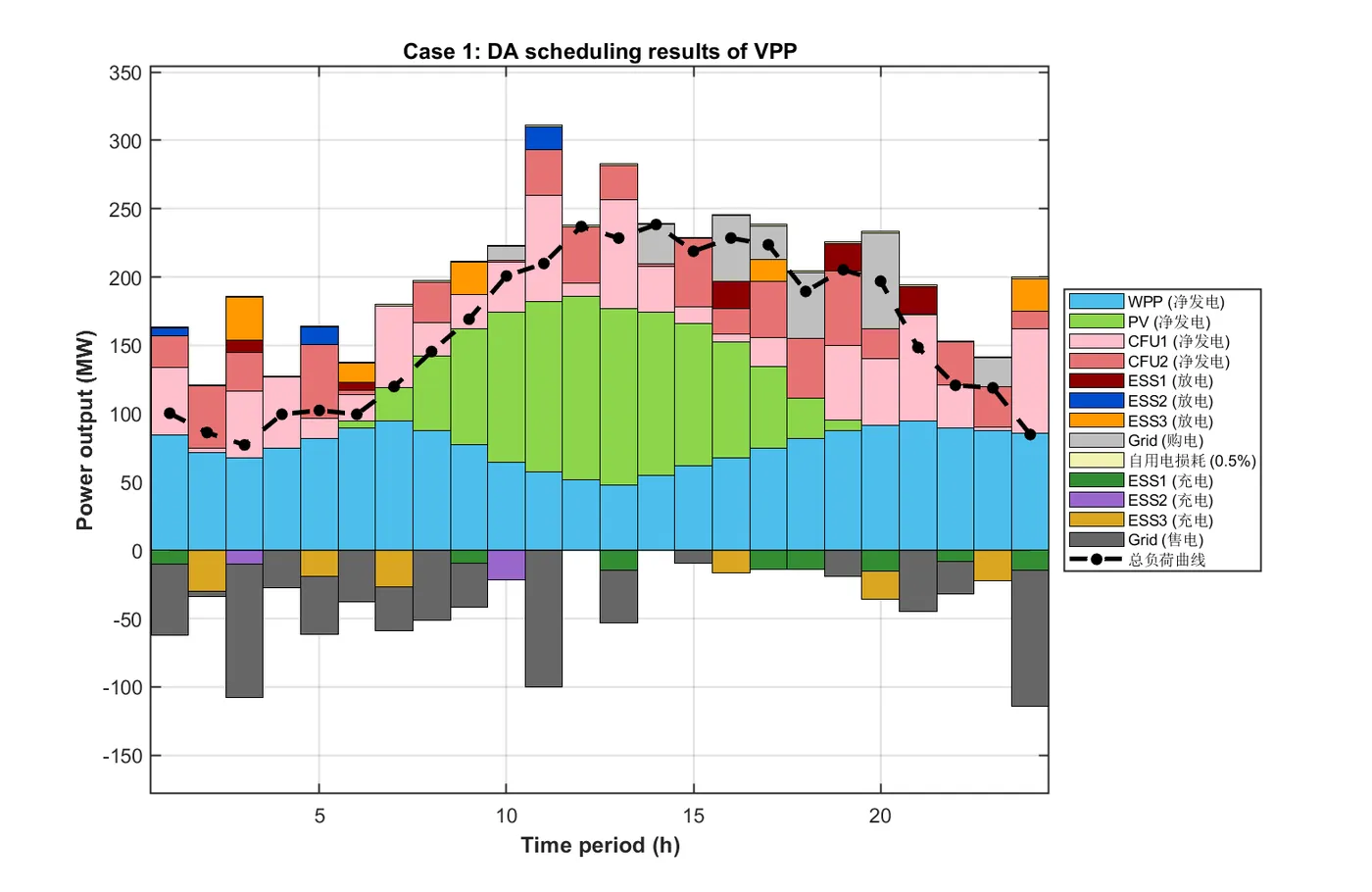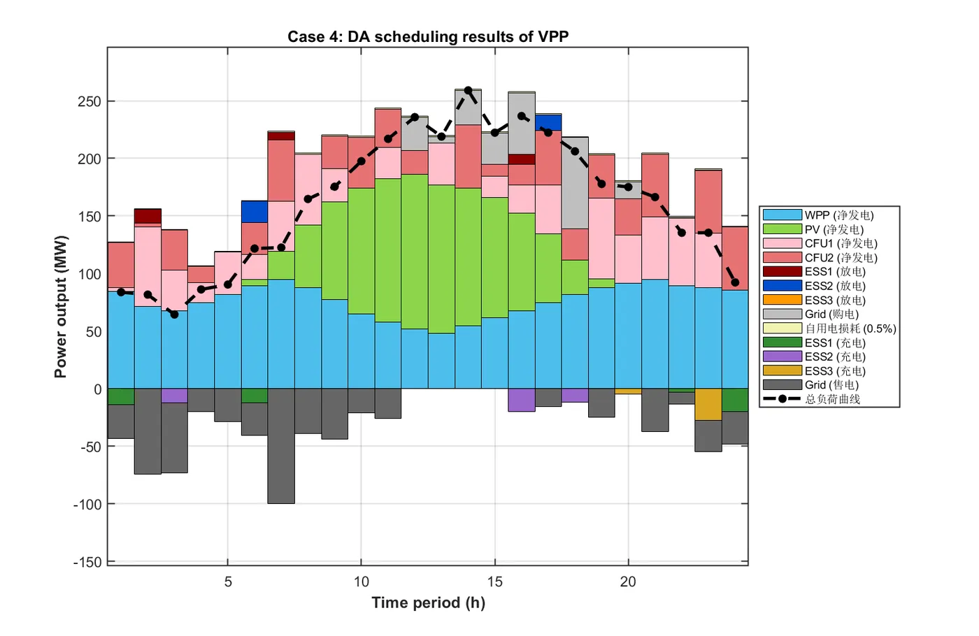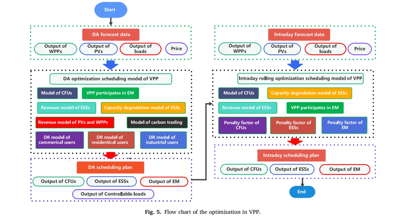 本研究提出了一种基于燃煤机组(CFU)使用权租赁机制与多用户需求响应(DR)策略的虚拟电厂(VPP)多时间尺度经济调度策略。为保护储能系统(ESS)利益并确保VPP运营商制定最优调度方案,本文采用同时考虑放电深度(DOD)与荷电状态(SOC)的ESS容量衰减模型。策略分为日前(DA)与日内两个时间尺度。数值分析得出以下主要结论:
