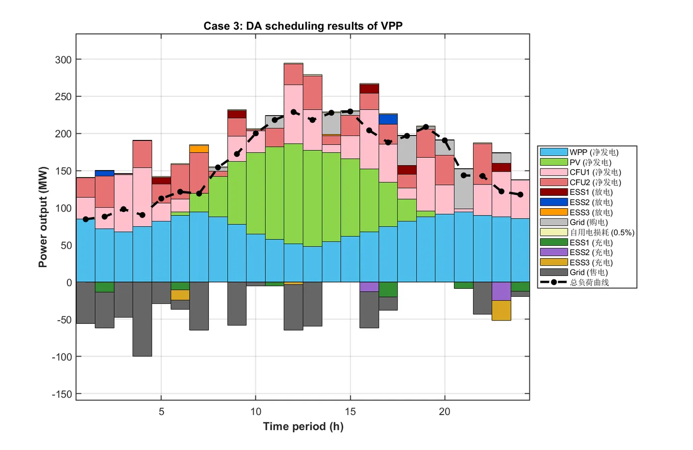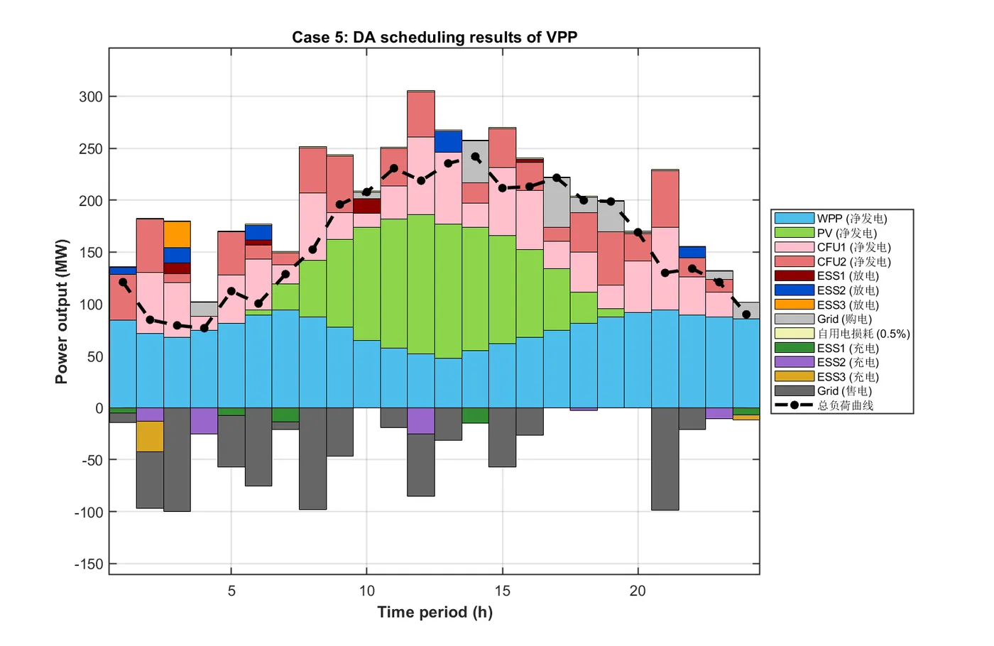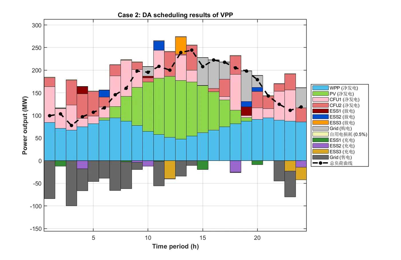 本研究提出了一种基于燃煤机组(CFU)使用权租赁机制与多用户需求响应(DR)策略的虚拟电厂(VPP)多时间尺度经济调度策略。为保护储能系统(ESS)利益并确保VPP运营商制定最优调度方案,本文采用同时考虑放电深度(DOD)与荷电状态(SOC)的ESS容量衰减模型。策略分为日前(DA)与日内两个时间尺度。数值分析得出以下主要结论: