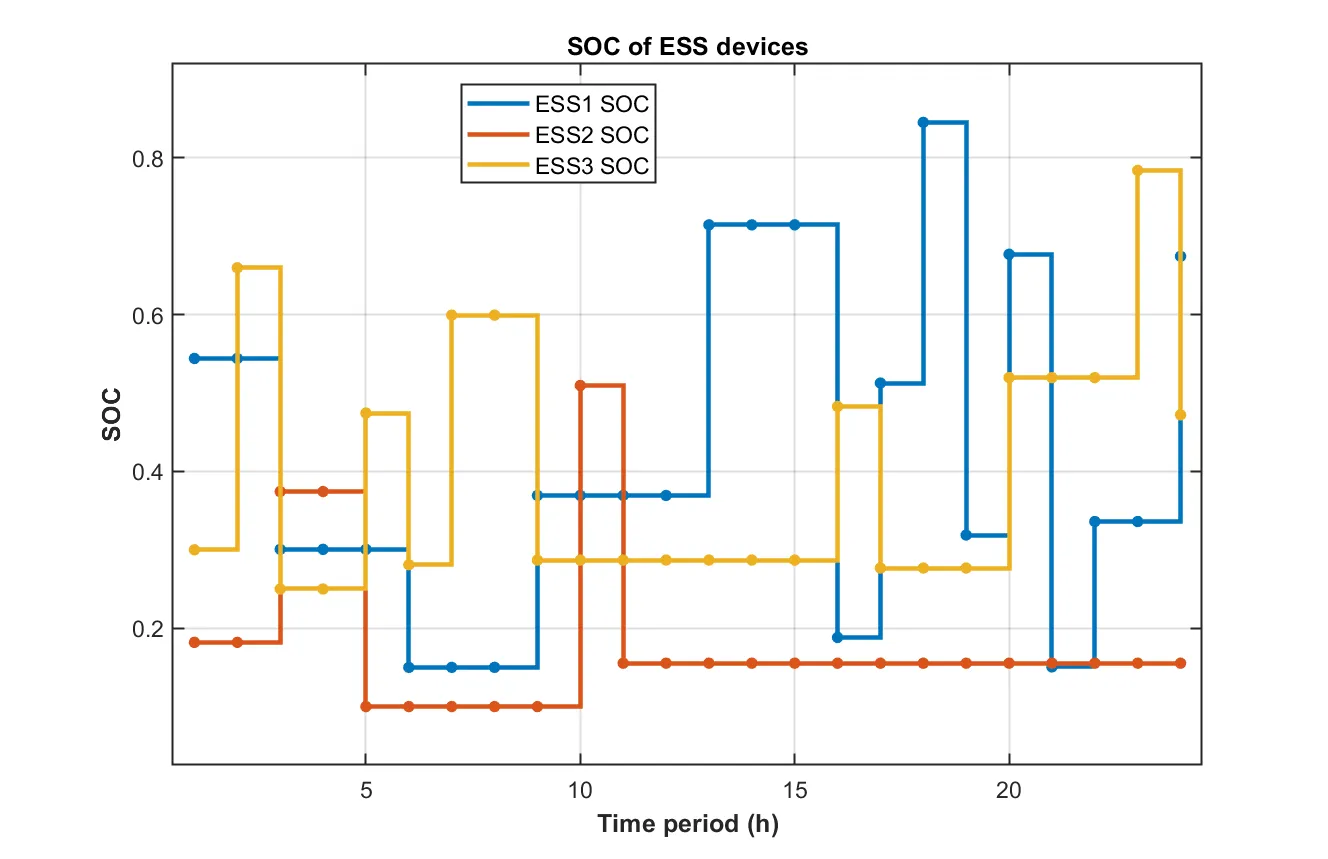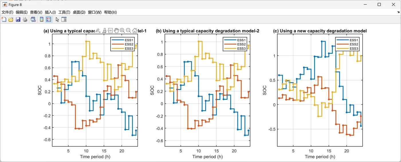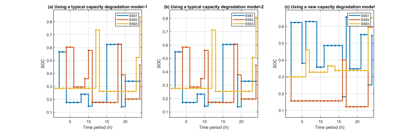 2. 与经典衰减模型相比,新容量衰减模型使各ESS利用率分别下降30.58%、26.69%与8.19%;若运营商改用两种典型旧模型,VPP运行成本将分别上升7.09%与1.87%。可见,衰减模型能否准确描述ESS退化状态,不仅关乎VPP调度决策的最优性,也影响内部成员后续收益分配。
