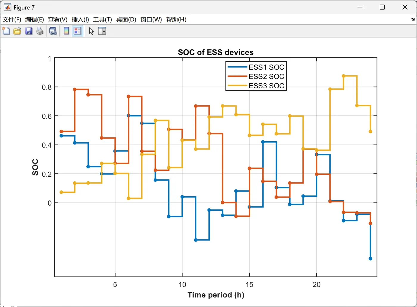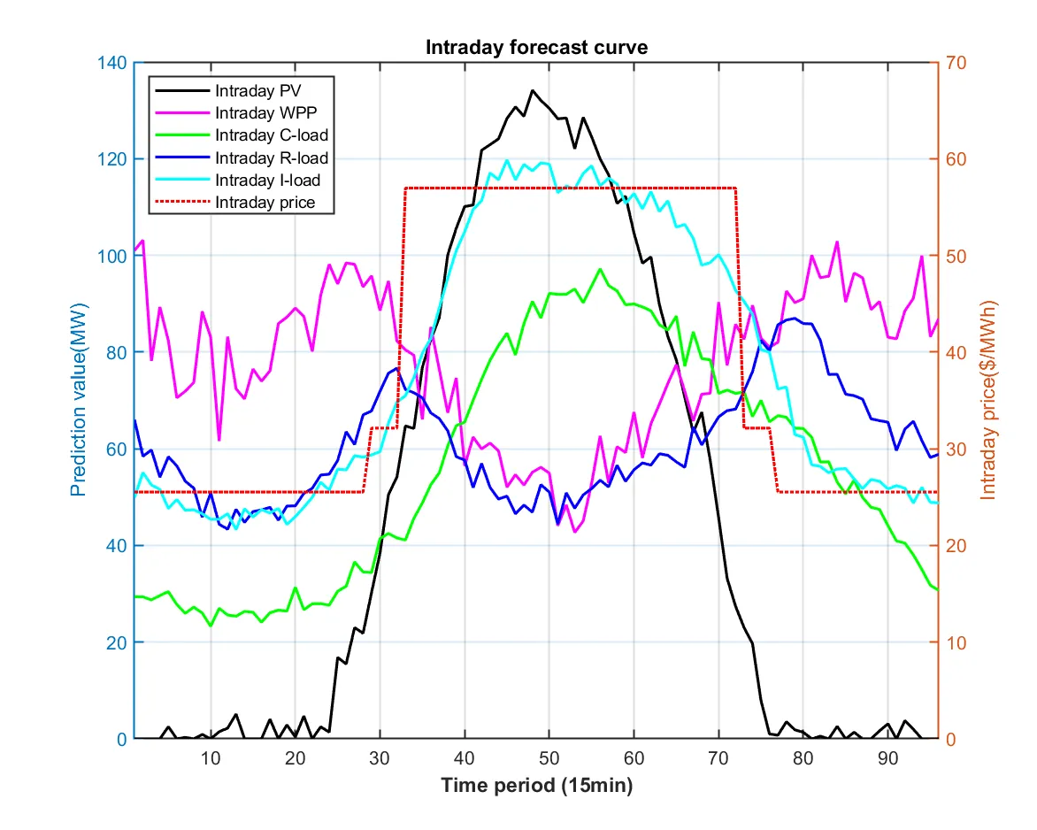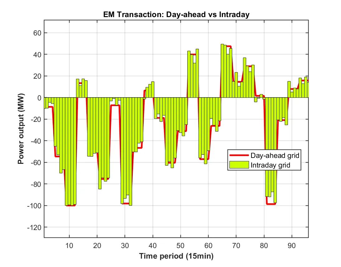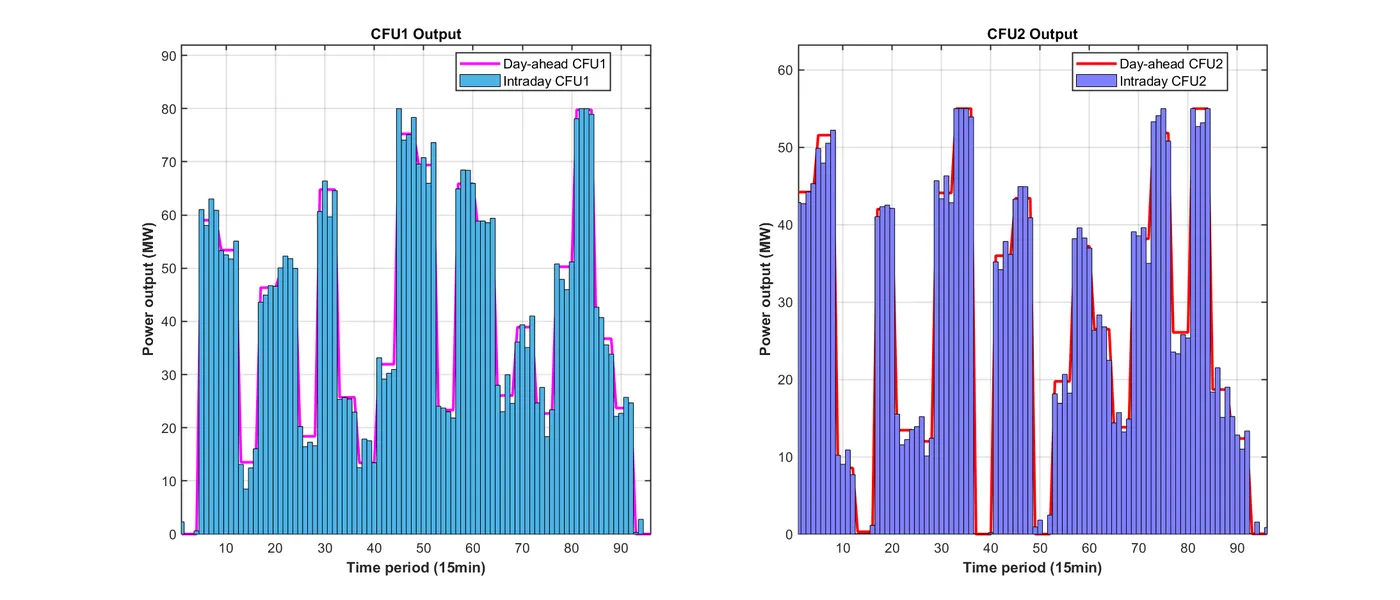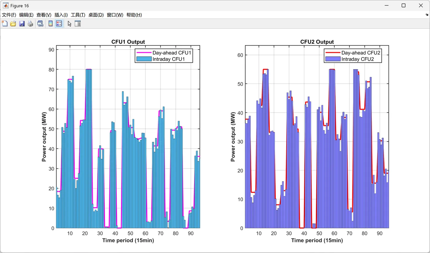 function PlotIntradayFigures(Data, Result_DA) % 生成日内调度图表 % 输入: Data-系统参数, Result_DA-日前调度结果 fprintf(' 正在生成日内调度图表...\n'); PlotFig16_IntradayForecast(Data); % 日内预测曲线 PlotFig17_CFU_Comparison(Data, Result_DA); % CFU日前日内对比 PlotFig18_ESS_Comparison(Data, Result_DA); % ESS日前日内对比 PlotFig19_EM_Comparison(Data, Result_DA); % EM交易日前日内对比 fprintf(' 日内调度图表生成完成!\n'); end %% 图16: 日内预测曲线 function PlotFig16_IntradayForecast(Data) fig = figure('Position', [100, 100, 750, 600]); set(fig, 'Color', 'w'); t_ID = 1:96; % 96个15分钟时段 % 左Y轴: 功率预测 yyaxis left plot(t_ID, Data.P_PV_ID, '-', 'Color', [0 0 0], 'LineWidth', 1.5); hold on; % 光伏 plot(t_ID, Data.P_WPP_ID, '-', 'Color', [1 0 1], 'LineWidth', 1.5); % 风电 plot(t_ID, Data.P_load_C_ID, '-', 'Color', [0 1 0], 'LineWidth', 1.5); % 商业负荷 plot(t_ID, Data.P_load_R_ID, '-', 'Color', [0 0 1], 'LineWidth', 1.5); % 居民负荷 plot(t_ID, Data.P_load_I_ID, '-', 'Color', [0 1 1], 'LineWidth', 1.5); % 工业负荷 ylabel('Prediction value(MW)', 'FontSize', 11); ylim([0 140]); % 右Y轴: 电价 yyaxis right plot(t_ID, Data.lambda_pur_ID, ':', 'Color', [1 0 0], 'LineWidth', 1.5); ylabel('Intraday price($/MWh)', 'FontSize', 11); ylim([0 70]); xlabel('Time period (15min)', 'FontSize', 12, 'FontWeight', 'bold'); title('Intraday forecast curve', 'FontSize', 13, 'FontWeight', 'bold'); legend({'Intraday PV', 'Intraday WPP', 'Intraday C-load', 'Intraday R-load', 'Intraday I-load', 'Intraday price'}, ... 'Location', 'northwest', 'FontSize', 9); grid on; box on; xlim([1, 96]); set(gca, 'FontSize', 10, 'LineWidth', 1); saveas(fig, 'Figures/Fig16_Intraday_Forecast.png'); end %% 图17: CFU日前日内对比 function PlotFig17_CFU_Comparison(Data, R) % 模拟日内调度结果(在日前基础上增加随机波动) rng(123); P_CFU1_ID = repelem(R.P_DG(1,:), 4) + randn(1, 96) * 3; % 将24时段扩展到96时段并加波动 P_CFU2_ID = repelem(R.P_DG(2,:), 4) + randn(1, 96) * 2; P_CFU1_ID = max(0, min(P_CFU1_ID, Data.DG(1).P_max)); % 限制在可行范围 P_CFU2_ID = max(0, min(P_CFU2_ID, Data.DG(2).P_max)); fig = figure('Position', [100, 100, 1400, 600]); set(fig, 'Color', 'w'); t_ID = 1:96; subplot(1, 2, 1); hold on; box on; grid on; plot(t_ID, repelem(R.P_DG(1,:), 4), '-', 'Color', [1 0 1], 'LineWidth', 2); % 日前计划 bar(t_ID, P_CFU1_ID, 'FaceColor', [0.3 0.7 0.9], 'EdgeColor', 'k', 'LineWidth', 0.5, 'BarWidth', 1); % 日内实际 xlabel('Time period (15min)', 'FontSize', 11, 'FontWeight', 'bold'); ylabel('Power output (MW)', 'FontSize', 11, 'FontWeight', 'bold'); title('CFU1 Output', 'FontSize', 12, 'FontWeight', 'bold'); legend('Day-ahead CFU1', 'Intraday CFU1', 'Location', 'best', 'FontSize', 10); xlim([1, 96]); % 自动计算Y轴范围 cfu1_max = max([P_CFU1_ID, repelem(R.P_DG(1,:), 4)]); ylim([0, cfu1_max * 1.15]); set(gca, 'FontSize', 10, 'LineWidth', 1); subplot(1, 2, 2); hold on; box on; grid on; plot(t_ID, repelem(R.P_DG(2,:), 4), '-', 'Color', [1 0 0], 'LineWidth', 2); % 日前计划 bar(t_ID, P_CFU2_ID, 'FaceColor', [0.5 0.5 1], 'EdgeColor', 'k', 'LineWidth', 0.5, 'BarWidth', 1); % 日内实际 xlabel('Time period (15min)', 'FontSize', 11, 'FontWeight', 'bold'); ylabel('Power output (MW)', 'FontSize', 11, 'FontWeight', 'bold'); title('CFU2 Output', 'FontSize', 12, 'FontWeight', 'bold'); legend('Day-ahead CFU2', 'Intraday CFU2', 'Location', 'best', 'FontSize', 10); xlim([1, 96]); % 自动计算Y轴范围 cfu2_max = max([P_CFU2_ID, repelem(R.P_DG(2,:), 4)]); ylim([0, cfu2_max * 1.15]); set(gca, 'FontSize', 10, 'LineWidth', 1); saveas(fig, 'Figures/Fig17_CFU_Comparison.png'); end %% 图18: ESS日前日内对比 function PlotFig18_ESS_Comparison(Data, R) % 模拟日内调度(在日前基础上加波动) rng(456); P_ESS1_ID = repelem(R.P_ESS_dis(1,:) - R.P_ESS_ch(1,:), 4) + randn(1, 96) * 1.5; P_ESS2_ID = repelem(R.P_ESS_dis(2,:) - R.P_ESS_ch(2,:), 4) + randn(1, 96) * 1.5; P_ESS3_ID = repelem(R.P_ESS_dis(3,:) - R.P_ESS_ch(3,:), 4) + randn(1, 96) * 2; % 限制在充放电功率范围内 P_ESS1_ID = max(-Data.ESS(1).P_ch_max, min(P_ESS1_ID, Data.ESS(1).P_dis_max)); P_ESS2_ID = max(-Data.ESS(2).P_ch_max, min(P_ESS2_ID, Data.ESS(2).P_dis_max)); P_ESS3_ID = max(-Data.ESS(3).P_ch_max, min(P_ESS3_ID, Data.ESS(3).P_dis_max)); fig = figure('Position', [100, 100, 1400, 1000]); set(fig, 'Color', 'w'); t_ID = 1:96; subplot(3, 1, 1); hold on; box on; grid on; P_ESS1_DA = R.P_ESS_dis(1,:) - R.P_ESS_ch(1,:); % 日前净功率 plot(t_ID, repelem(P_ESS1_DA, 4), '-', 'Color', [0 0 0], 'LineWidth', 2); % 日前计划 bar(t_ID, P_ESS1_ID, 'FaceColor', [0.6 0 0], 'EdgeColor', 'k', 'LineWidth', 0.5, 'BarWidth', 1); % 日内实际 xlabel('Time period (15min)', 'FontSize', 10); ylabel('Power output (MW)', 'FontSize', 10); title('ESS1 Output', 'FontSize', 11, 'FontWeight', 'bold'); legend('Day-ahead ESS1', 'Intraday ESS1', 'Location', 'best', 'FontSize', 9); xlim([1, 96]); ess1_min = min([P_ESS1_ID, repelem(P_ESS1_DA, 4)]); ess1_max = max([P_ESS1_ID, repelem(P_ESS1_DA, 4)]); ess1_range = ess1_max - ess1_min; ylim([ess1_min - 0.15*ess1_range, ess1_max + 0.15*ess1_range]); subplot(3, 1, 2); hold on; box on; grid on; P_ESS2_DA = R.P_ESS_dis(2,:) - R.P_ESS_ch(2,:); plot(t_ID, repelem(P_ESS2_DA, 4), '-', 'Color', [0 0 0], 'LineWidth', 2); bar(t_ID, P_ESS2_ID, 'FaceColor', [1 0 0], 'EdgeColor', 'k', 'LineWidth', 0.5, 'BarWidth', 1); xlabel('Time period (15min)', 'FontSize', 10); ylabel('Power output (MW)', 'FontSize', 10); title('ESS2 Output', 'FontSize', 11, 'FontWeight', 'bold'); legend('Day-ahead ESS2', 'Intraday ESS2', 'Location', 'best', 'FontSize', 9); xlim([1, 96]); ess2_min = min([P_ESS2_ID, repelem(P_ESS2_DA, 4)]); ess2_max = max([P_ESS2_ID, repelem(P_ESS2_DA, 4)]); ess2_range = ess2_max - ess2_min; ylim([ess2_min - 0.15*ess2_range, ess2_max + 0.15*ess2_range]); subplot(3, 1, 3); hold on; box on; grid on; P_ESS3_DA = R.