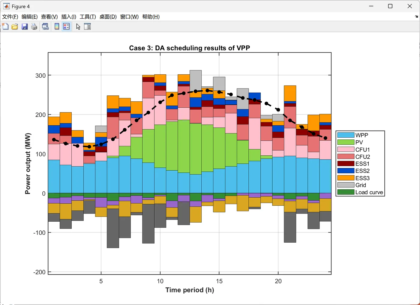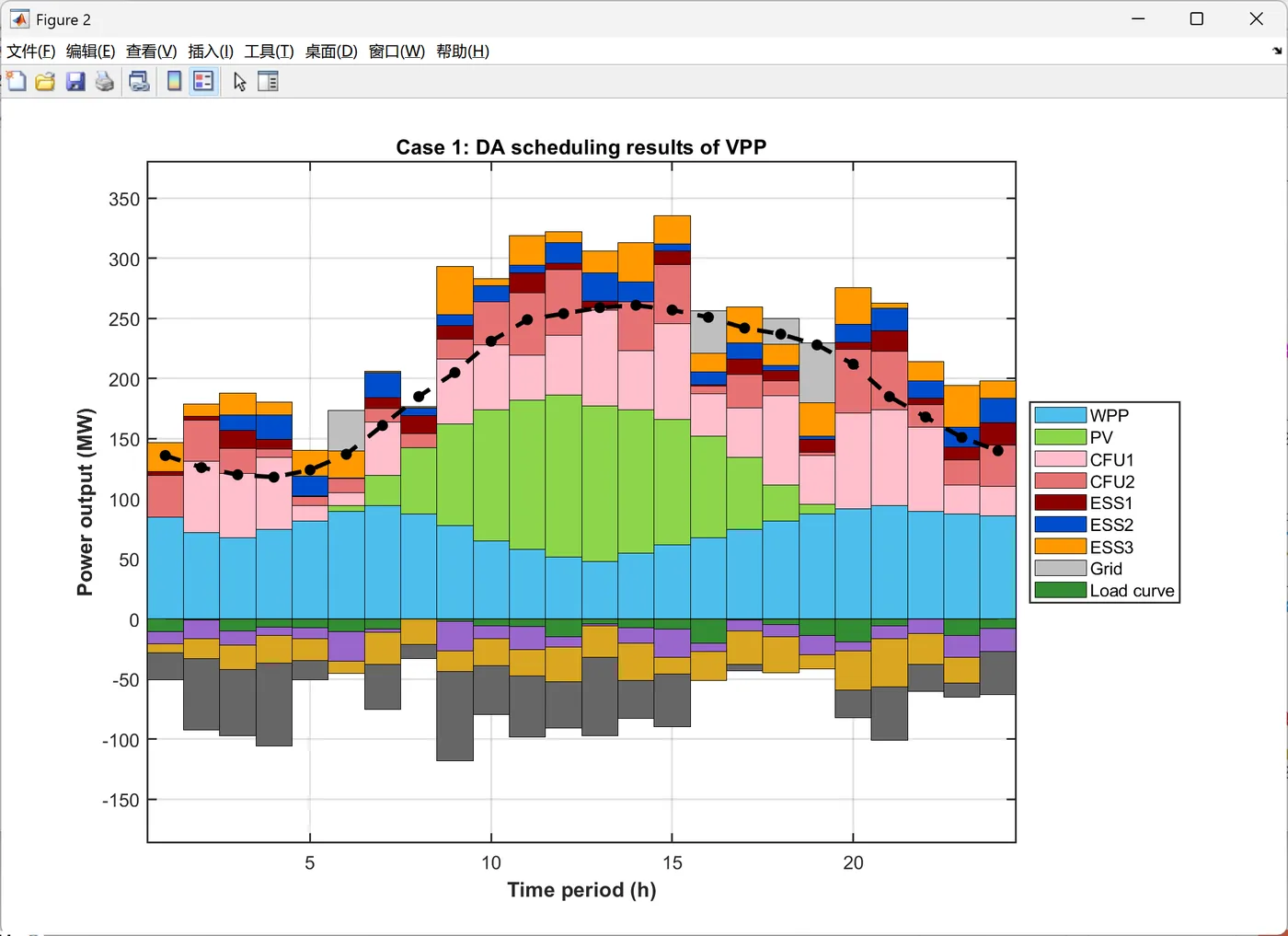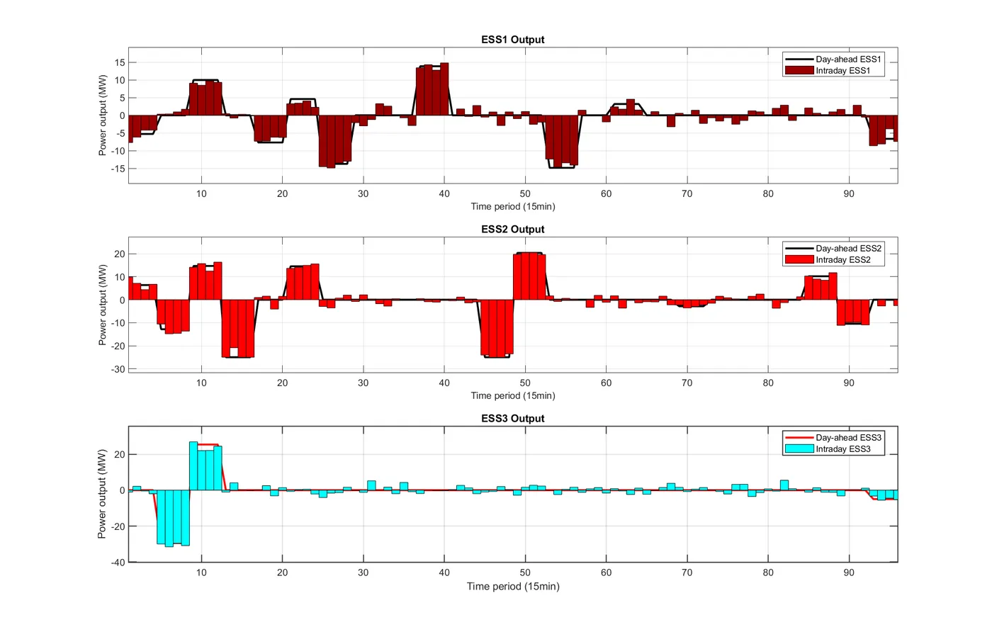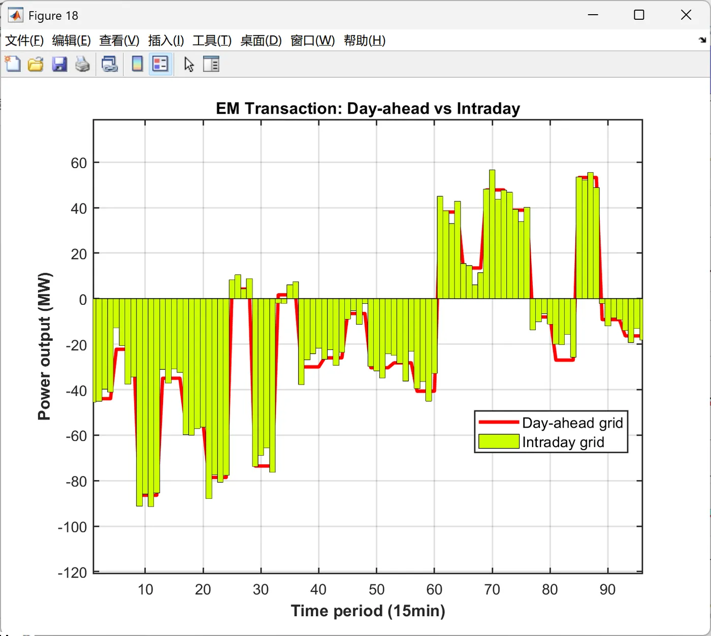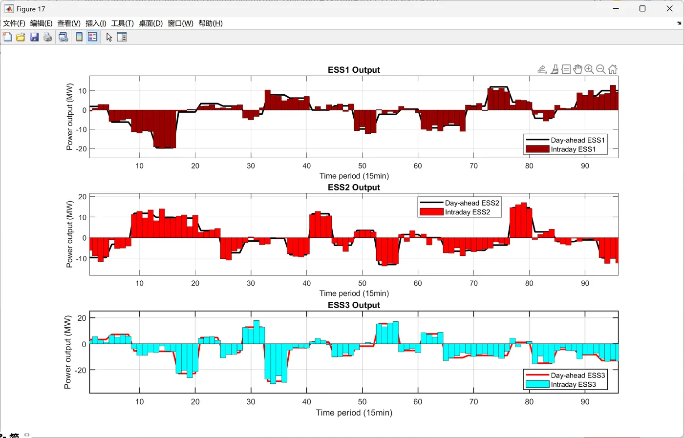 function PlotIntradayFigures(Data, Result_DA) % 生成日内调度图表 % 输入: Data-系统参数, Result_DA-日前调度结果 fprintf(' 正在生成日内调度图表...\n'); PlotFig16_IntradayForecast(Data); % 日内预测曲线 PlotFig17_CFU_Comparison(Data, Result_DA); % CFU日前日内对比 PlotFig18_ESS_Comparison(Data, Result_DA); % ESS日前日内对比 PlotFig19_EM_Comparison(Data, Result_DA); % EM交易日前日内对比 fprintf(' 日内调度图表生成完成!\n'); end %% 图16: 日内预测曲线 function PlotFig16_IntradayForecast(Data) fig = figure('Position', [100, 100, 750, 600]); set(fig, 'Color', 'w'); t_ID = 1:96; % 96个15分钟时段 % 左Y轴: 功率预测 yyaxis left plot(t_ID, Data.P_PV_ID, '-', 'Color', [0 0 0], 'LineWidth', 1.5); hold on; % 光伏 plot(t_ID, Data.P_WPP_ID, '-', 'Color', [1 0 1], 'LineWidth', 1.5); % 风电 plot(t_ID, Data.P_load_C_ID, '-', 'Color', [0 1 0], 'LineWidth', 1.5); % 商业负荷 plot(t_ID, Data.P_load_R_ID, '-', 'Color', [0 0 1], 'LineWidth', 1.5); % 居民负荷 plot(t_ID, Data.P_load_I_ID, '-', 'Color', [0 1 1], 'LineWidth', 1.5); % 工业负荷 ylabel('Prediction value(MW)', 'FontSize', 11); ylim([0 140]); % 右Y轴: 电价 yyaxis right plot(t_ID, Data.lambda_pur_ID, ':', 'Color', [1 0 0], 'LineWidth', 1.5); ylabel('Intraday price($/MWh)', 'FontSize', 11); ylim([0 70]); xlabel('Time period (15min)', 'FontSize', 12, 'FontWeight', 'bold'); title('Intraday forecast curve', 'FontSize', 13, 'FontWeight', 'bold'); legend({'Intraday PV', 'Intraday WPP', 'Intraday C-load', 'Intraday R-load', 'Intraday I-load', 'Intraday price'}, ... 'Location', 'northwest', 'FontSize', 9); grid on; box on; xlim([1, 96]); set(gca, 'FontSize', 10, 'LineWidth', 1); saveas(fig, 'Figures/Fig16_Intraday_Forecast.png'); end %% 图17: CFU日前日内对比 function PlotFig17_CFU_Comparison(Data, R) % 模拟日内调度结果(在日前基础上增加随机波动) rng(123); P_CFU1_ID = repelem(R.P_DG(1,:), 4) + randn(1, 96) * 3; % 将24时段扩展到96时段并加波动 P_CFU2_ID = repelem(R.P_DG(2,:), 4) + randn(1, 96) * 2; P_CFU1_ID = max(0, min(P_CFU1_ID, Data.DG(1).P_max)); % 限制在可行范围 P_CFU2_ID = max(0, min(P_CFU2_ID, Data.DG(2).P_max)); fig = figure('Position', [100, 100, 1400, 600]); set(fig, 'Color', 'w'); t_ID = 1:96; subplot(1, 2, 1); hold on; box on; grid on; plot(t_ID, repelem(R.P_DG(1,:), 4), '-', 'Color', [1 0 1], 'LineWidth', 2); % 日前计划 bar(t_ID, P_CFU1_ID, 'FaceColor', [0.3 0.7 0.9], 'EdgeColor', 'k', 'LineWidth', 0.5, 'BarWidth', 1); % 日内实际 xlabel('Time period (15min)', 'FontSize', 11, 'FontWeight', 'bold'); ylabel('Power output (MW)', 'FontSize', 11, 'FontWeight', 'bold'); title('CFU1 Output', 'FontSize', 12, 'FontWeight', 'bold'); legend('Day-ahead CFU1', 'Intraday CFU1', 'Location', 'best', 'FontSize', 10); xlim([1, 96]); % 自动计算Y轴范围 cfu1_max = max([P_CFU1_ID, repelem(R.P_DG(1,:), 4)]); ylim([0, cfu1_max * 1.15]); set(gca, 'FontSize', 10, 'LineWidth', 1); subplot(1, 2, 2); hold on; box on; grid on; plot(t_ID, repelem(R.P_DG(2,:), 4), '-', 'Color', [1 0 0], 'LineWidth', 2); % 日前计划 bar(t_ID, P_CFU2_ID, 'FaceColor', [0.5 0.5 1], 'EdgeColor', 'k', 'LineWidth', 0.5, 'BarWidth', 1); % 日内实际 xlabel('Time period (15min)', 'FontSize', 11, 'FontWeight', 'bold'); ylabel('Power output (MW)', 'FontSize', 11, 'FontWeight', 'bold'); title('CFU2 Output', 'FontSize', 12, 'FontWeight', 'bold'); legend('Day-ahead CFU2', 'Intraday CFU2', 'Location', 'best', 'FontSize', 10); xlim([1, 96]); % 自动计算Y轴范围 cfu2_max = max([P_CFU2_ID, repelem(R.P_DG(2,:), 4)]); ylim([0, cfu2_max * 1.15]); set(gca, 'FontSize', 10, 'LineWidth', 1); saveas(fig, 'Figures/Fig17_CFU_Comparison.png'); end %% 图18: ESS日前日内对比 function PlotFig18_ESS_Comparison(Data, R) % 模拟日内调度(在日前基础上加波动) rng(456); P_ESS1_ID = repelem(R.P_ESS_dis(1,:) - R.P_ESS_ch(1,:), 4) + randn(1, 96) * 1.5; P_ESS2_ID = repelem(R.P_ESS_dis(2,:) - R.P_ESS_ch(2,:), 4) + randn(1, 96) * 1.5; P_ESS3_ID = repelem(R.P_ESS_dis(3,:) - R.P_ESS_ch(3,:), 4) + randn(1, 96) * 2; % 限制在充放电功率范围内 P_ESS1_ID = max(-Data.ESS(1).P_ch_max, min(P_ESS1_ID, Data.ESS(1).P_dis_max)); P_ESS2_ID = max(-Data.ESS(2).P_ch_max, min(P_ESS2_ID, Data.ESS(2).P_dis_max)); P_ESS3_ID = max(-Data.ESS(3).P_ch_max, min(P_ESS3_ID, Data.ESS(3).P_dis_max)); fig = figure('Position', [100, 100, 1400, 1000]); set(fig, 'Color', 'w'); t_ID = 1:96; subplot(3, 1, 1); hold on; box on; grid on; P_ESS1_DA = R.P_ESS_dis(1,:) - R.P_ESS_ch(1,:); % 日前净功率 plot(t_ID, repelem(P_ESS1_DA, 4), '-', 'Color', [0 0 0], 'LineWidth', 2); % 日前计划 bar(t_ID, P_ESS1_ID, 'FaceColor', [0.6 0 0], 'EdgeColor', 'k', 'LineWidth', 0.5, 'BarWidth', 1); % 日内实际 xlabel('Time period (15min)', 'FontSize', 10); ylabel('Power output (MW)', 'FontSize', 10); title('ESS1 Output', 'FontSize', 11, 'FontWeight', 'bold'); legend('Day-ahead ESS1', 'Intraday ESS1', 'Location', 'best', 'FontSize', 9); xlim([1, 96]); ess1_min = min([P_ESS1_ID, repelem(P_ESS1_DA, 4)]); ess1_max = max([P_ESS1_ID, repelem(P_ESS1_DA, 4)]); ess1_range = ess1_max - ess1_min; ylim([ess1_min - 0.15*ess1_range, ess1_max + 0.15*ess1_range]); subplot(3, 1, 2); hold on; box on; grid on; P_ESS2_DA = R.P_ESS_dis(2,:) - R.P_ESS_ch(2,:); plot(t_ID, repelem(P_ESS2_DA, 4), '-', 'Color', [0 0 0], 'LineWidth', 2); bar(t_ID, P_ESS2_ID, 'FaceColor', [1 0 0], 'EdgeColor', 'k', 'LineWidth', 0.5, 'BarWidth', 1); xlabel('Time period (15min)', 'FontSize', 10); ylabel('Power output (MW)', 'FontSize', 10); title('ESS2 Output', 'FontSize', 11, 'FontWeight', 'bold'); legend('Day-ahead ESS2', 'Intraday ESS2', 'Location', 'best', 'FontSize', 9); xlim([1, 96]); ess2_min = min([P_ESS2_ID, repelem(P_ESS2_DA, 4)]); ess2_max = max([P_ESS2_ID, repelem(P_ESS2_DA, 4)]); ess2_range = ess2_max - ess2_min; ylim([ess2_min - 0.15*ess2_range, ess2_max + 0.15*ess2_range]); subplot(3, 1, 3); hold on; box on; grid on; P_ESS3_DA = R.