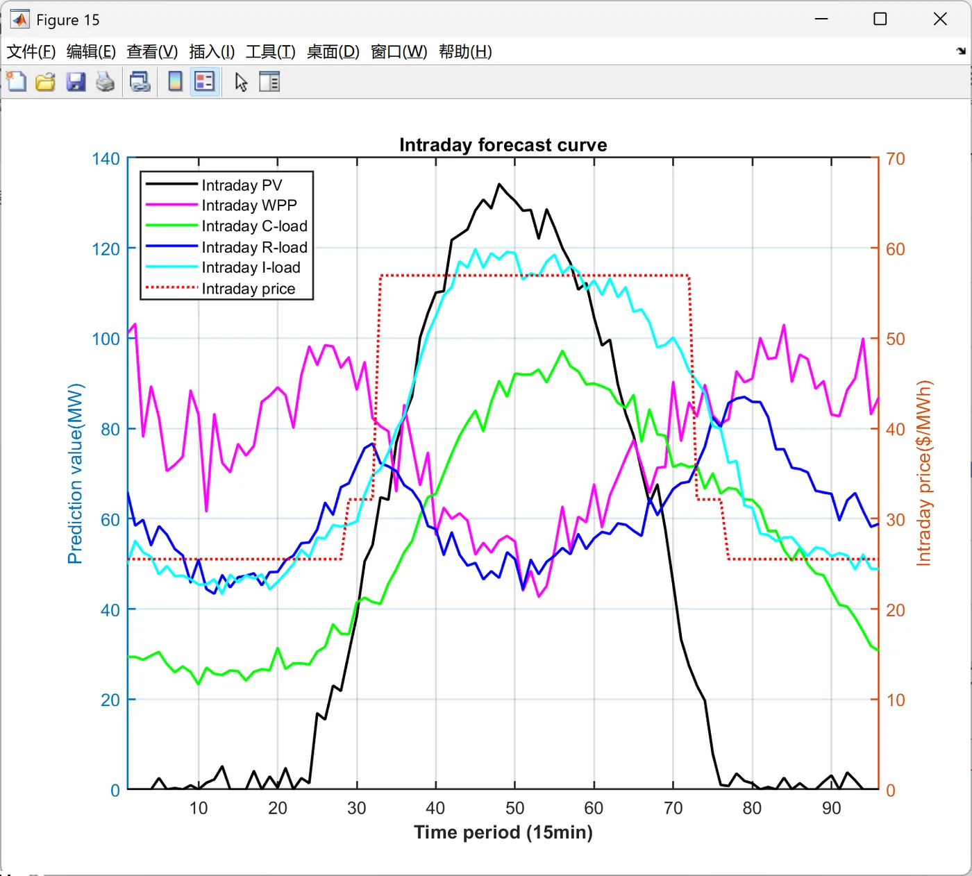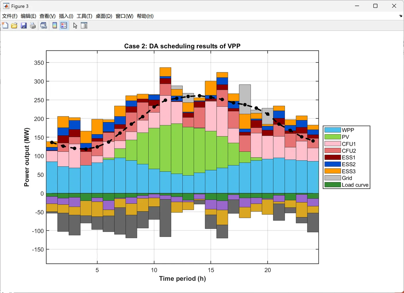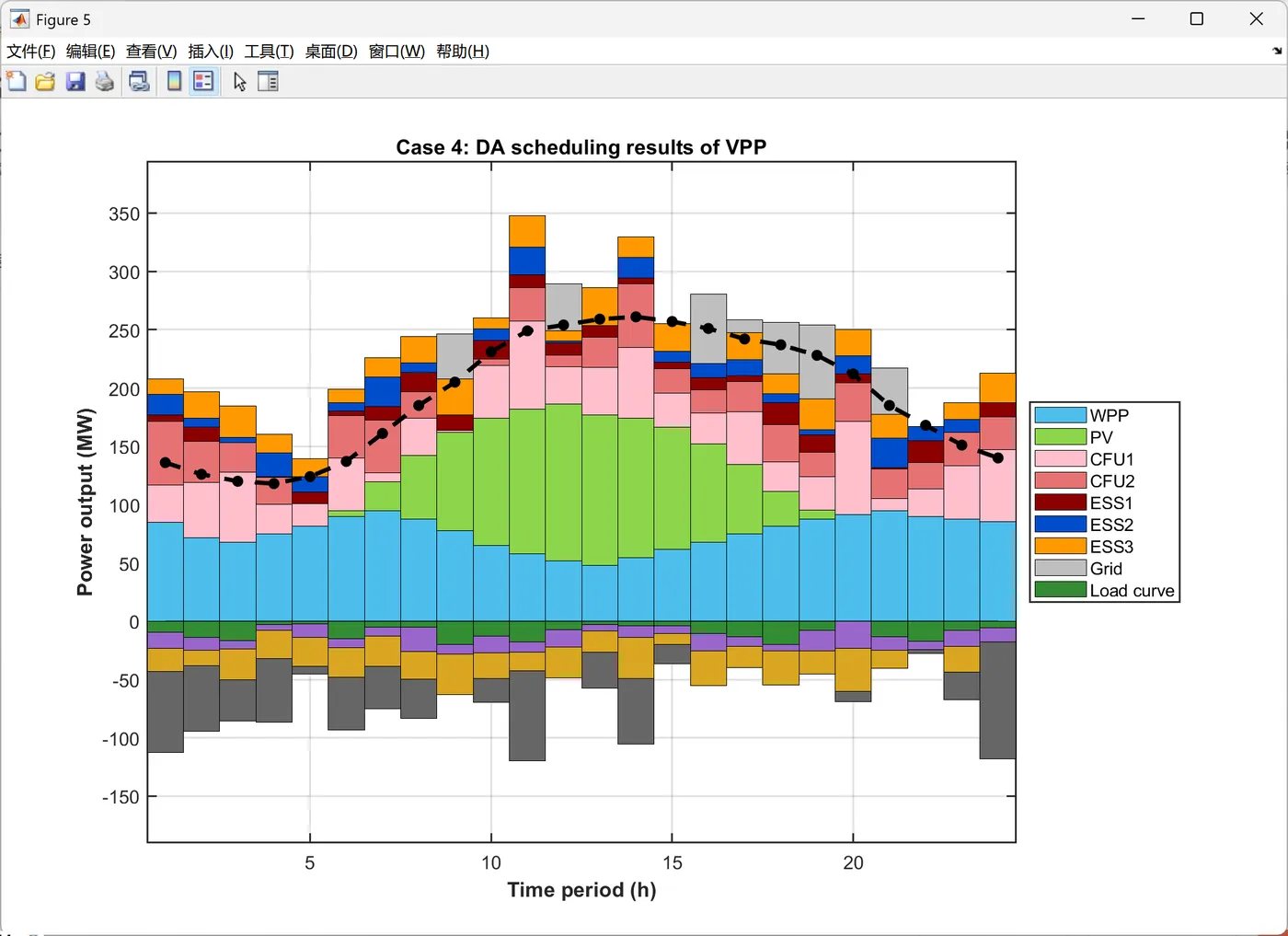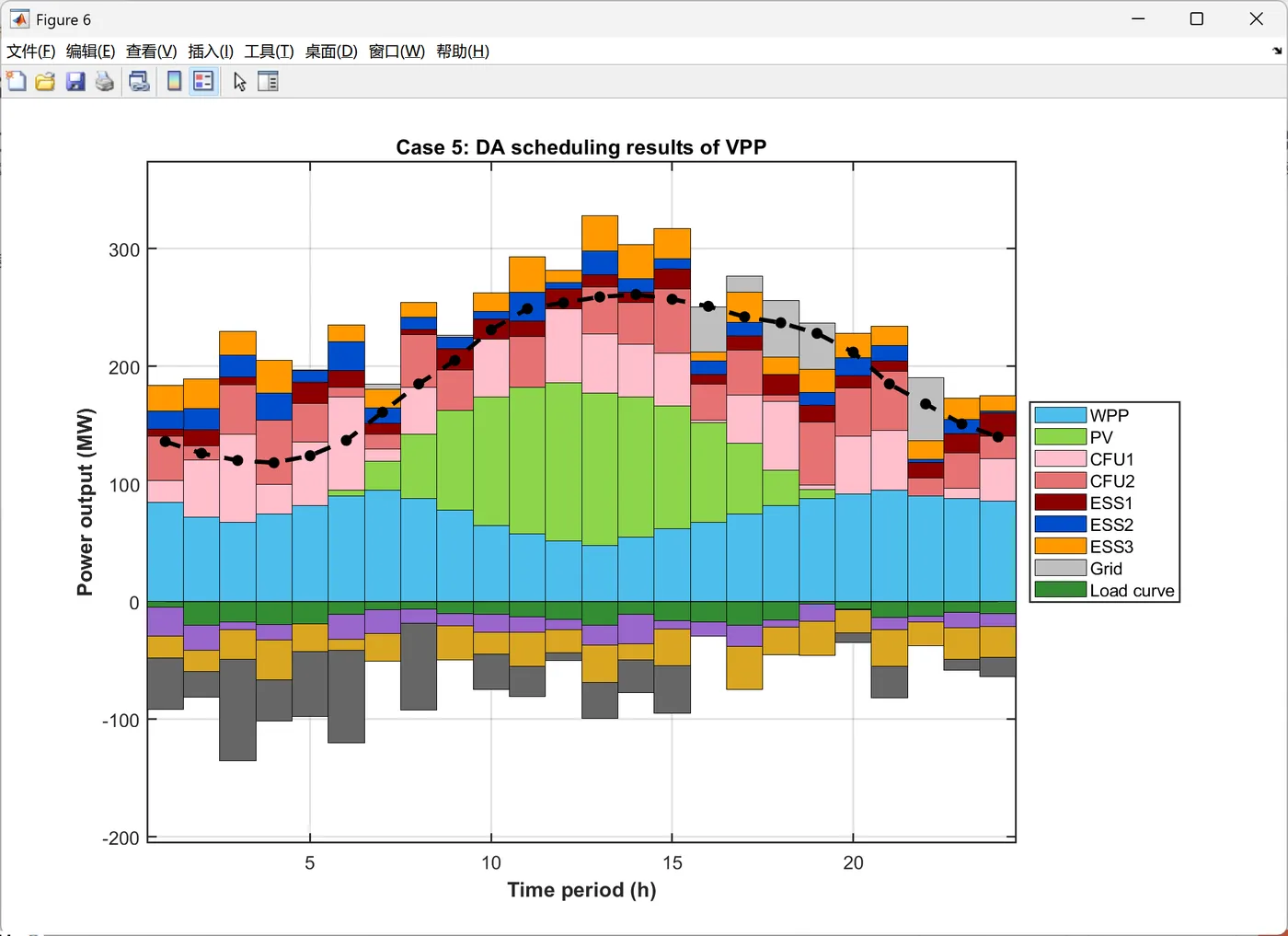 function PlotIntradayFigures(Data, Result_DA) % 生成日内调度图表 % 输入: Data-系统参数, Result_DA-日前调度结果 fprintf(' 正在生成日内调度图表...\n'); PlotFig16_IntradayForecast(Data); % 日内预测曲线 PlotFig17_CFU_Comparison(Data, Result_DA); % CFU日前日内对比 PlotFig18_ESS_Comparison(Data, Result_DA); % ESS日前日内对比 PlotFig19_EM_Comparison(Data, Result_DA); % EM交易日前日内对比 fprintf(' 日内调度图表生成完成!\n'); end %% 图16: 日内预测曲线 function PlotFig16_IntradayForecast(Data) fig = figure('Position', [100, 100, 750, 600]); set(fig, 'Color', 'w'); t_ID = 1:96; % 96个15分钟时段 % 左Y轴: 功率预测 yyaxis left plot(t_ID, Data.P_PV_ID, '-', 'Color', [0 0 0], 'LineWidth', 1.5); hold on; % 光伏 plot(t_ID, Data.P_WPP_ID, '-', 'Color', [1 0 1], 'LineWidth', 1.5); % 风电 plot(t_ID, Data.P_load_C_ID, '-', 'Color', [0 1 0], 'LineWidth', 1.5); % 商业负荷 plot(t_ID, Data.P_load_R_ID, '-', 'Color', [0 0 1], 'LineWidth', 1.5); % 居民负荷 plot(t_ID, Data.P_load_I_ID, '-', 'Color', [0 1 1], 'LineWidth', 1.5); % 工业负荷 ylabel('Prediction value(MW)', 'FontSize', 11); ylim([0 140]); % 右Y轴: 电价 yyaxis right plot(t_ID, Data.lambda_pur_ID, ':', 'Color', [1 0 0], 'LineWidth', 1.5); ylabel('Intraday price($/MWh)', 'FontSize', 11); ylim([0 70]); xlabel('Time period (15min)', 'FontSize', 12, 'FontWeight', 'bold'); title('Intraday forecast curve', 'FontSize', 13, 'FontWeight', 'bold'); legend({'Intraday PV', 'Intraday WPP', 'Intraday C-load', 'Intraday R-load', 'Intraday I-load', 'Intraday price'}, ... 'Location', 'northwest', 'FontSize', 9); grid on; box on; xlim([1, 96]); set(gca, 'FontSize', 10, 'LineWidth', 1); saveas(fig, 'Figures/Fig16_Intraday_Forecast.png'); end %% 图17: CFU日前日内对比 function PlotFig17_CFU_Comparison(Data, R) % 模拟日内调度结果(在日前基础上增加随机波动) rng(123); P_CFU1_ID = repelem(R.P_DG(1,:), 4) + randn(1, 96) * 3; % 将24时段扩展到96时段并加波动 P_CFU2_ID = repelem(R.P_DG(2,:), 4) + randn(1, 96) * 2; P_CFU1_ID = max(0, min(P_CFU1_ID, Data.DG(1).P_max)); % 限制在可行范围 P_CFU2_ID = max(0, min(P_CFU2_ID, Data.DG(2).P_max)); fig = figure('Position', [100, 100, 1400, 600]); set(fig, 'Color', 'w'); t_ID = 1:96; subplot(1, 2, 1); hold on; box on; grid on; plot(t_ID, repelem(R.P_DG(1,:), 4), '-', 'Color', [1 0 1], 'LineWidth', 2); % 日前计划 bar(t_ID, P_CFU1_ID, 'FaceColor', [0.3 0.7 0.9], 'EdgeColor', 'k', 'LineWidth', 0.5, 'BarWidth', 1); % 日内实际 xlabel('Time period (15min)', 'FontSize', 11, 'FontWeight', 'bold'); ylabel('Power output (MW)', 'FontSize', 11, 'FontWeight', 'bold'); title('CFU1 Output', 'FontSize', 12, 'FontWeight', 'bold'); legend('Day-ahead CFU1', 'Intraday CFU1', 'Location', 'best', 'FontSize', 10); xlim([1, 96]); % 自动计算Y轴范围 cfu1_max = max([P_CFU1_ID, repelem(R.P_DG(1,:), 4)]); ylim([0, cfu1_max * 1.15]); set(gca, 'FontSize', 10, 'LineWidth', 1); subplot(1, 2, 2); hold on; box on; grid on; plot(t_ID, repelem(R.P_DG(2,:), 4), '-', 'Color', [1 0 0], 'LineWidth', 2); % 日前计划 bar(t_ID, P_CFU2_ID, 'FaceColor', [0.5 0.5 1], 'EdgeColor', 'k', 'LineWidth', 0.5, 'BarWidth', 1); % 日内实际 xlabel('Time period (15min)', 'FontSize', 11, 'FontWeight', 'bold'); ylabel('Power output (MW)', 'FontSize', 11, 'FontWeight', 'bold'); title('CFU2 Output', 'FontSize', 12, 'FontWeight', 'bold'); legend('Day-ahead CFU2', 'Intraday CFU2', 'Location', 'best', 'FontSize', 10); xlim([1, 96]); % 自动计算Y轴范围 cfu2_max = max([P_CFU2_ID, repelem(R.P_DG(2,:), 4)]); ylim([0, cfu2_max * 1.15]); set(gca, 'FontSize', 10, 'LineWidth', 1); saveas(fig, 'Figures/Fig17_CFU_Comparison.png'); end %% 图18: ESS日前日内对比 function PlotFig18_ESS_Comparison(Data, R) % 模拟日内调度(在日前基础上加波动) rng(456); P_ESS1_ID = repelem(R.P_ESS_dis(1,:) - R.P_ESS_ch(1,:), 4) + randn(1, 96) * 1.5; P_ESS2_ID = repelem(R.P_ESS_dis(2,:) - R.P_ESS_ch(2,:), 4) + randn(1, 96) * 1.5; P_ESS3_ID = repelem(R.P_ESS_dis(3,:) - R.P_ESS_ch(3,:), 4) + randn(1, 96) * 2; % 限制在充放电功率范围内 P_ESS1_ID = max(-Data.ESS(1).P_ch_max, min(P_ESS1_ID, Data.ESS(1).P_dis_max)); P_ESS2_ID = max(-Data.ESS(2).P_ch_max, min(P_ESS2_ID, Data.ESS(2).P_dis_max)); P_ESS3_ID = max(-Data.ESS(3).P_ch_max, min(P_ESS3_ID, Data.ESS(3).P_dis_max)); fig = figure('Position', [100, 100, 1400, 1000]); set(fig, 'Color', 'w'); t_ID = 1:96; subplot(3, 1, 1); hold on; box on; grid on; P_ESS1_DA = R.P_ESS_dis(1,:) - R.P_ESS_ch(1,:); % 日前净功率 plot(t_ID, repelem(P_ESS1_DA, 4), '-', 'Color', [0 0 0], 'LineWidth', 2); % 日前计划 bar(t_ID, P_ESS1_ID, 'FaceColor', [0.6 0 0], 'EdgeColor', 'k', 'LineWidth', 0.5, 'BarWidth', 1); % 日内实际 xlabel('Time period (15min)', 'FontSize', 10); ylabel('Power output (MW)', 'FontSize', 10); title('ESS1 Output', 'FontSize', 11, 'FontWeight', 'bold'); legend('Day-ahead ESS1', 'Intraday ESS1', 'Location', 'best', 'FontSize', 9); xlim([1, 96]); ess1_min = min([P_ESS1_ID, repelem(P_ESS1_DA, 4)]); ess1_max = max([P_ESS1_ID, repelem(P_ESS1_DA, 4)]); ess1_range = ess1_max - ess1_min; ylim([ess1_min - 0.15*ess1_range, ess1_max + 0.15*ess1_range]); subplot(3, 1, 2); hold on; box on; grid on; P_ESS2_DA = R.P_ESS_dis(2,:) - R.P_ESS_ch(2,:); plot(t_ID, repelem(P_ESS2_DA, 4), '-', 'Color', [0 0 0], 'LineWidth', 2); bar(t_ID, P_ESS2_ID, 'FaceColor', [1 0 0], 'EdgeColor', 'k', 'LineWidth', 0.5, 'BarWidth', 1); xlabel('Time period (15min)', 'FontSize', 10); ylabel('Power output (MW)', 'FontSize', 10); title('ESS2 Output', 'FontSize', 11, 'FontWeight', 'bold'); legend('Day-ahead ESS2', 'Intraday ESS2', 'Location', 'best', 'FontSize', 9); xlim([1, 96]); ess2_min = min([P_ESS2_ID, repelem(P_ESS2_DA, 4)]); ess2_max = max([P_ESS2_ID, repelem(P_ESS2_DA, 4)]); ess2_range = ess2_max - ess2_min; ylim([ess2_min - 0.15*ess2_range, ess2_max + 0.15*ess2_range]); subplot(3, 1, 3); hold on; box on; grid on; P_ESS3_DA = R.