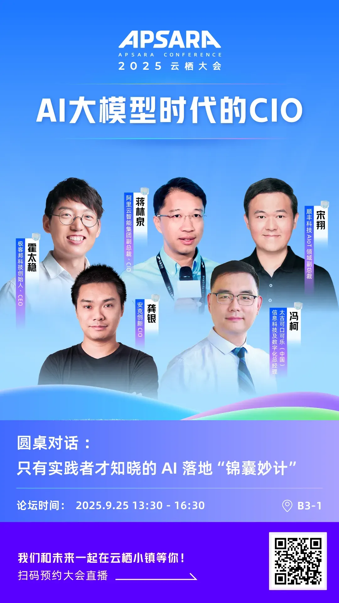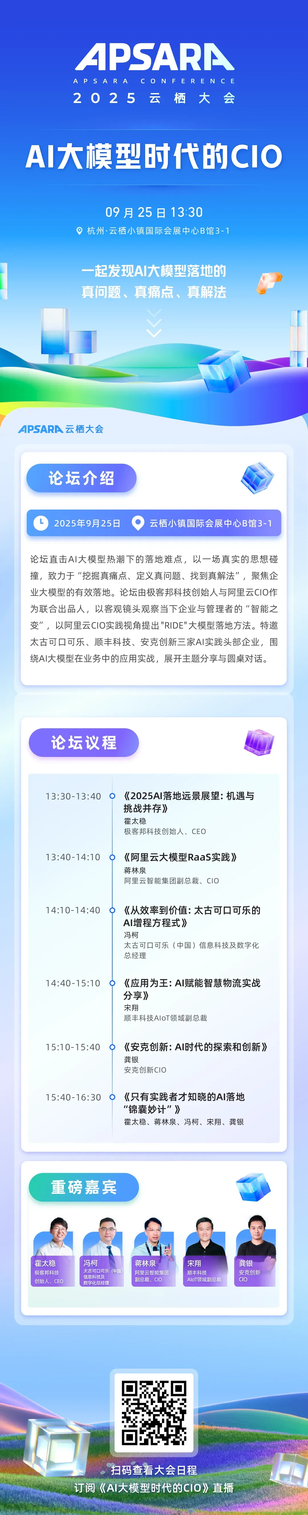 于是,这场云栖大会的CIO专场,期望站在亲历者的高远视角,还原落地迷雾事实,分享实战破局的解法。从阿里云到多家AI先锋实践企业,围绕企业大模型的深度思考与体系落地,以All in AI后的全盘经验与思想碰撞,为大家找到复用之路,交付一场真实有效的、实战者的思想盛宴。