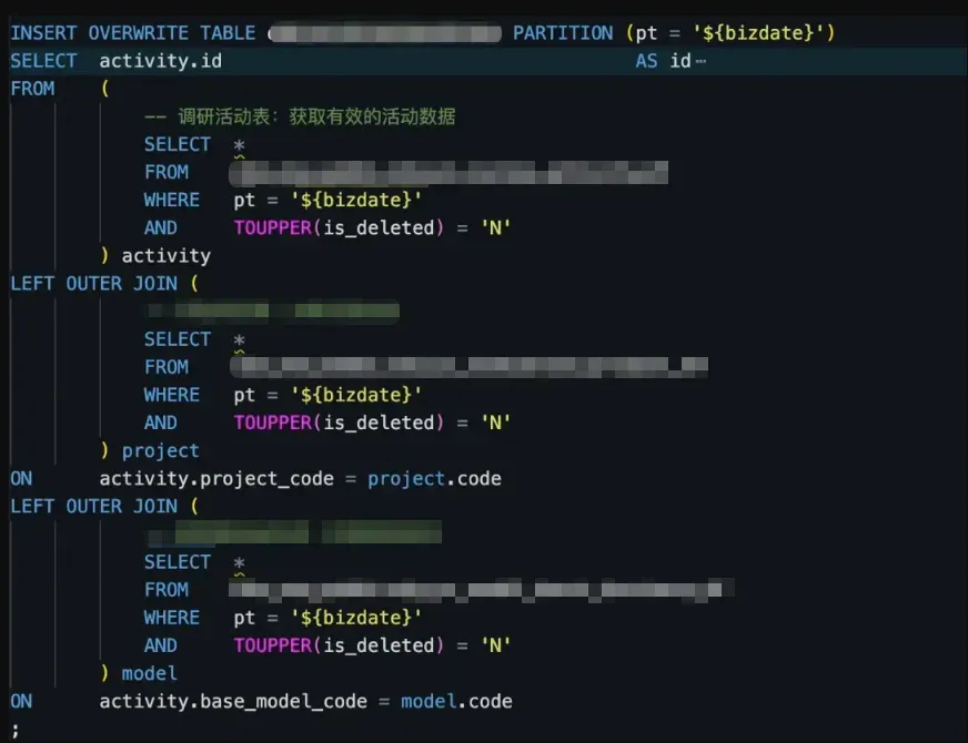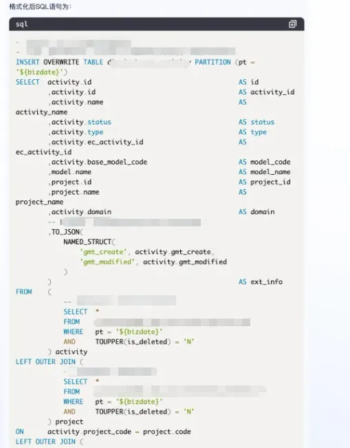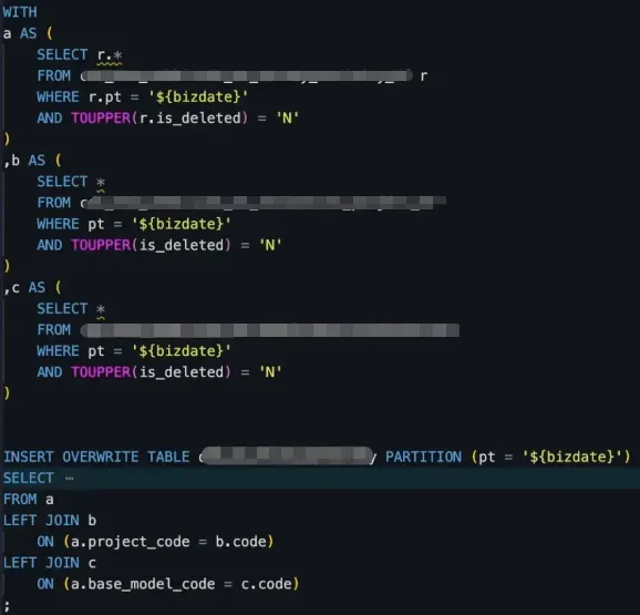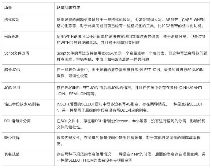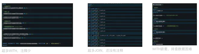 小D的模型重构完了,他通知下游同学修改下依赖,下游同学打开自己负责的任务一看...这是什么历史代码连基本对齐都没有,根本看不懂,想一键格式化,结果发现d2上的格式化真的就只是一键对齐,好像帮我改了又好像没啥效果...... 许多规范性的代码问题根本无法解决:比如 代码无注释、超长加工逻辑、多层WITH嵌套等等,严重影响到工作中的协作开发效率......