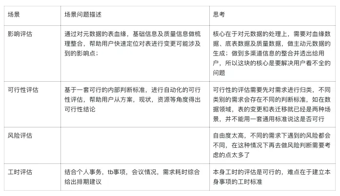 - 需求评估:通过对影响面-可行性-风险-成本(工时)的智能评估,助力数据同学快速获得评估结果,减少前期的过多投入。