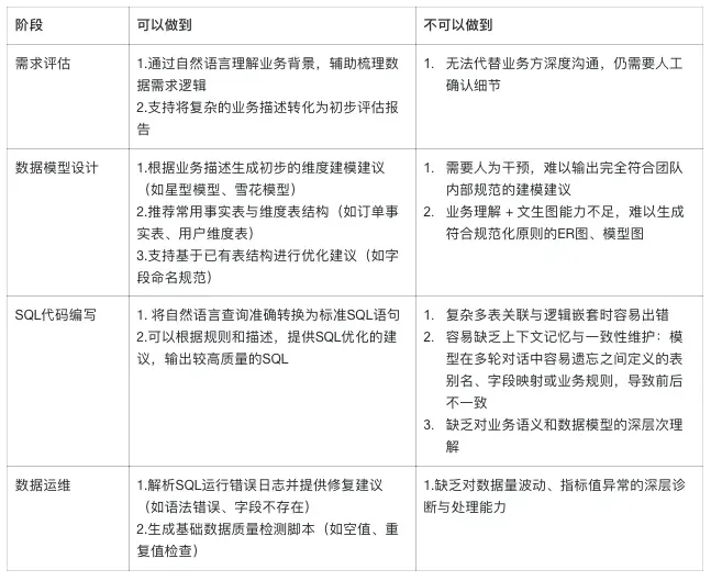 进入正题,在应对新的数据需求时,我们通常遵循 需求评估-模型设计-SQL开发-测试发布-数据质量运维 的多阶段协作流程。值得注意的是,这些环节并非线性推进,而是与日常研发工作深度融合。就像小D,在运维过程中发现问题,需及时启动影响范围评估及迭代修复等保障机制,确保线上数据的准确性,也因此带来了连锁反应导致大量额外工作。正是这样的复杂情况下,我们意识到AI技术的价值:通过自动化工具与智能决策辅助,帮助我们从低效重复的ROI泥潭中突围,实现从“研发提效”到“技能跃迁、能力提升”的跨越,推动我们自身与业务价值的双重增长。