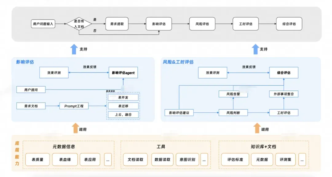 按照设想,我们首先需要从需求文档中提取到要做评估的内容(表),当然也可以接受用户直给的提问。接下来,「影响评估」帮助同学做表血缘信息、质量信息、生产信息、应用信息一体化的盘点&评估;然后交由「风险评估」帮助判断下其中是否里面存在一些隐含的风险需要注意;最后「工时评估」像是个简易版的数字人告诉同学,你做完这个需求大概需要多少工期,最近还有哪些事排着呢。