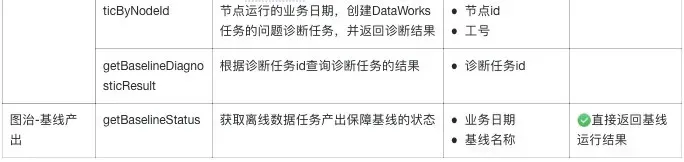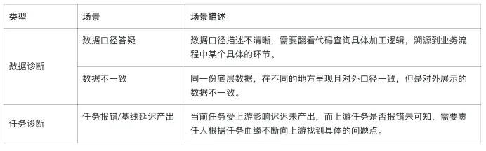 - 任务诊断:通过识别任务及其上游任务、基线的产出情况,辅助判断数据异常情况是否来源于任务异常,如果真有异常,可以定位到我们具体哪个任务有异常,异常点是什么,最好能直接告诉我们怎么解决。