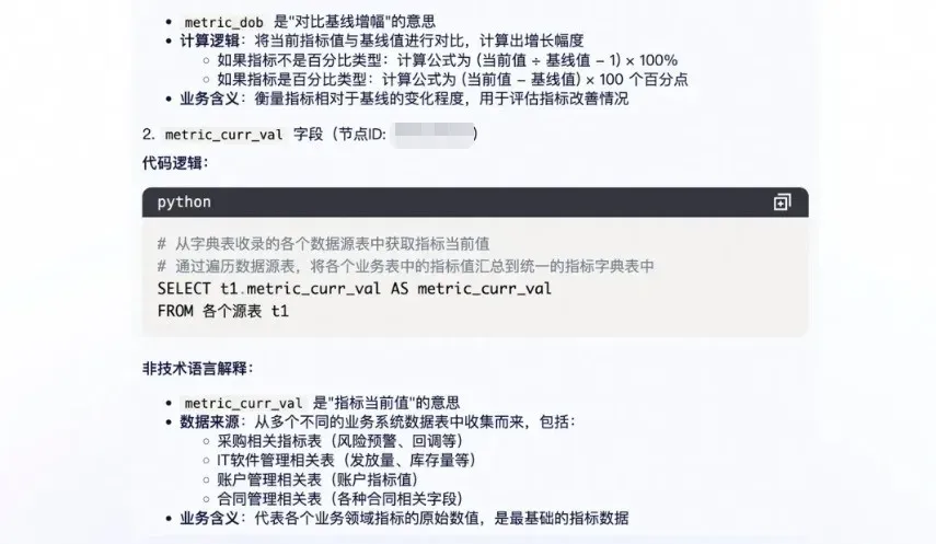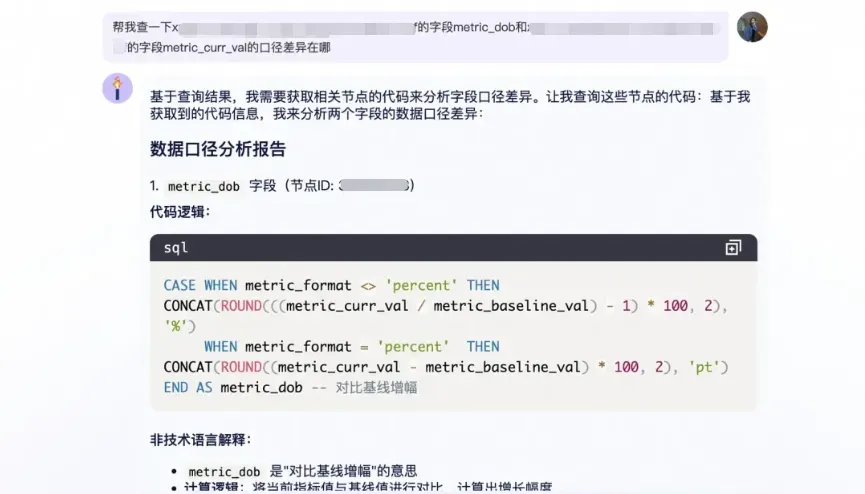 - 数据诊断:Agent帮我们完成找代码、理解代码、溯源并整理输出的工作,从代码层面直接告诉我们数据的计算口径是什么(不直接查表,减少数据安全风险),减少我们人工扒代码,花时间查口径、理解数据的人力成本。