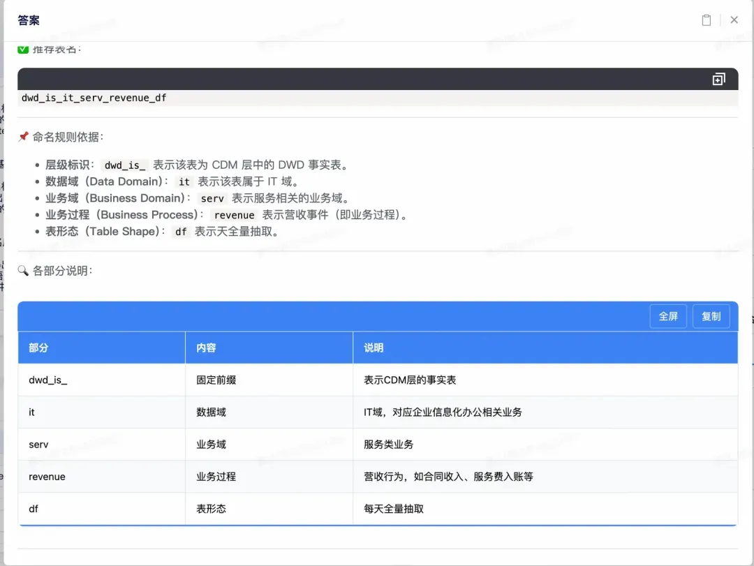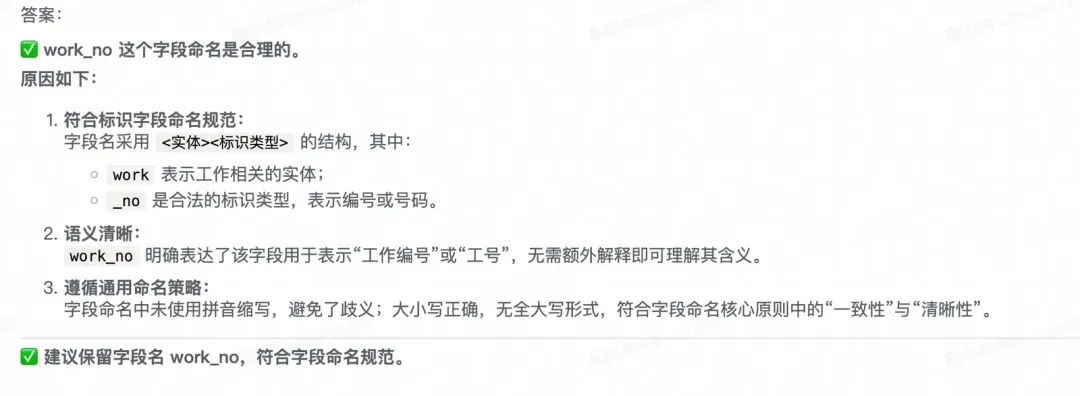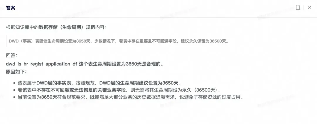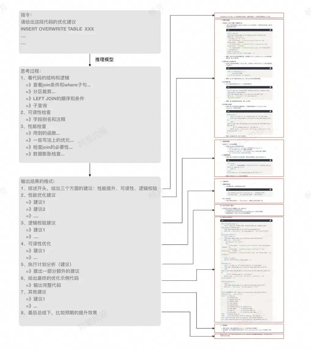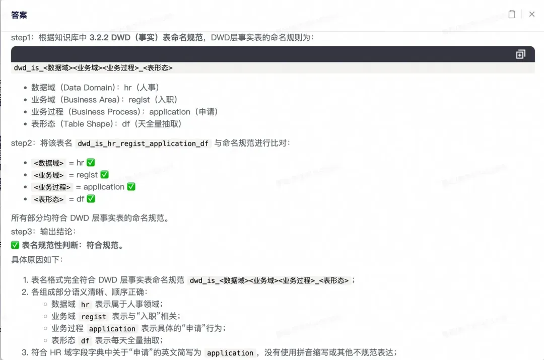 1)首先是代码规范检查,目标很明确,确保SQL代码符合团队规范(语法、命名、注释、格式等),这里我们只需要依托强大的基座模型 + 私有知识库即可实现,多次调整Prompt后即可实现标准化的输出。私有知识库部分是完全可以依托【模型评审】场景的积累,快速复用的。