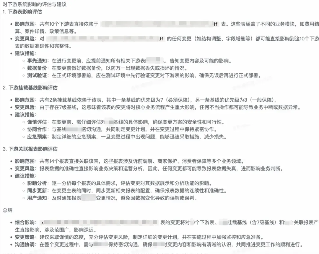 基于这个通用型Agent,在【问题排查】场景中,我们只需要调用该Agent来帮我们查出异常字段/表的各上游节点,并根据字段血缘深度,由大模型帮我们梳理出相关字段的加工逻辑,从而辅助我们的口径答疑。