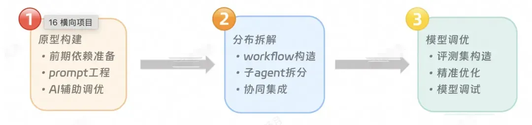 具体来说,三步走策略。一、先基于我们的目标,通过prompt工程做一个初版agent,看它的输出形态是否满足我们的要求;二、对我们的原型agent做子agent拆解,使每个agent保持独立性,具体可扩展,可复用以及易维护的能力,没有问题再做整体workflow的构造;三、模型调优,这一步实际是贯穿在我们整个构建过程中的,评测集必不可少,优化手段也非常多(prompt调优、参数调优、数据增强等等手段),具体落到每个场景下做针对性调优。