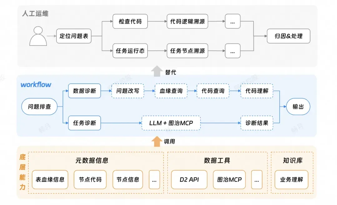 - 通性能力:依托节点或者表的血缘分析引擎实现跨任务/表的数据任务和代码加工逻辑追踪。LLM自主选择调用工具,快速定位问题点。
