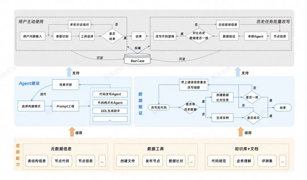 回想一下,当面临数据异常或者任务出错时,传统排查流程往往需要我们手动梳理任务链路、解析代码逻辑,这种人工排查方式存在效率低、耗时长等问题。为此,我们希望建设【问题排查Agent】,通过以下两大核心模块实现自动化问题定位: