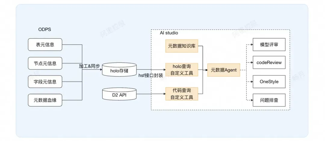 传统排查问题时,往往不是直接查看发现问题的节点就能立马定位原因,需要层层溯源定位源头,Agent要做到这一步,就需要知道怎么去找节点的上游。而查找节点上游需要利用到ODPS元数据的血缘信息。除此之外,Agent要排查数据的计算口径,也需要能够查找到节点代码便于理解,因此在项目初期,我们抽出了共性问题——ODPS元数据。将所有需要利用元数据信息的场景封装成一个通用型agent来帮我们实现,支持查找表或节点的基础信息,包括字段、节点id、表/节点/字段的血缘。