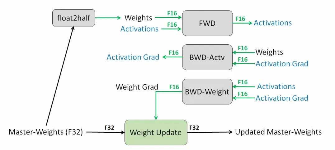 首先会拷贝一份FP32权重副本,然后权重转为FP16进行前向传播并计算loss后,通过FP16进行反向传播计算梯度,最后转换为FP32更新到FP32的权重上。