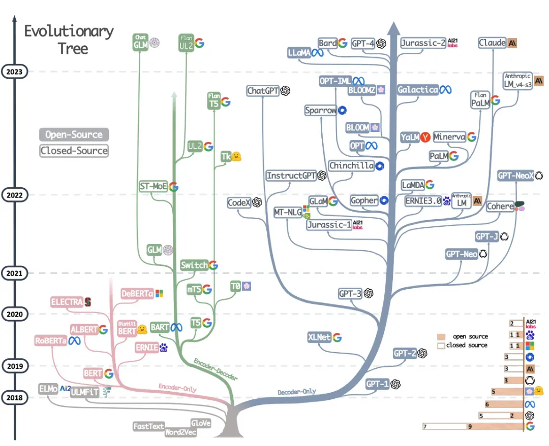 图中,实心方块代表开源模型,空心方块代表闭源模型;右下角的条形图显示了各公司和机构的模型数量;纵轴上的垂直位置表示模型的发布日期。可以看出,NLP基础模型及Transformer架构的研究,对大模型的发展至关重要。