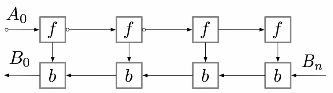 对于具有n层的简单馈送神经网络,梯度计算图如下图所示: