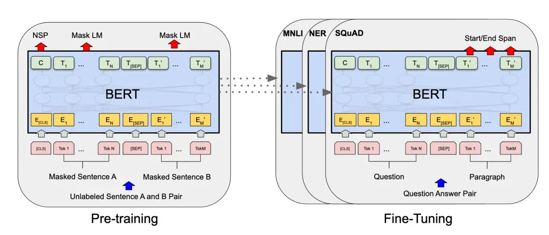 2)在微调阶段:BERT模型通过添加一个任务特定的头部(如分类器)并对整个模型进行端到端的监督训练,从而适应特定的NLP任务。