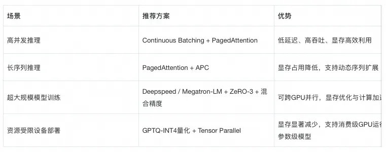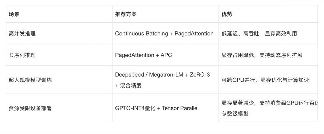 在实际的大模型落地场景时,通常需要在不同场景可以使用不同的技术方案组合,例如,如下不同场景的技术对比与选型建议: