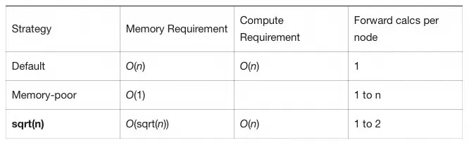 因此,通常使用的优化后方法为sqrt(n)步放置checkpoint策略:对于长度为n的链,每sqrt(n)步放置检查点。如果要求对任何节点最多计算两次,这是内存效率最高的策略。内存需求是 ,计算需求是一个额外的向前传递。这是目前在openai的gradient-checkpoints中采取的默认策略。
