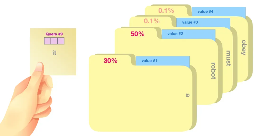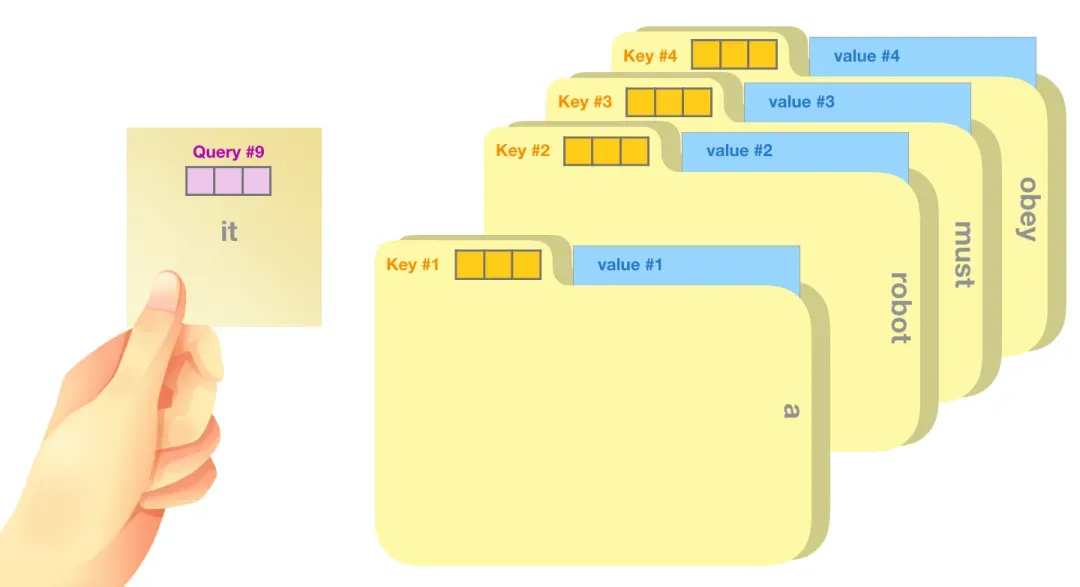 一个比喻是:这个过程就像在文件柜中搜索。Query查询就像写有研究主题的便签,而Key键则好比文件夹上的标签。[3]