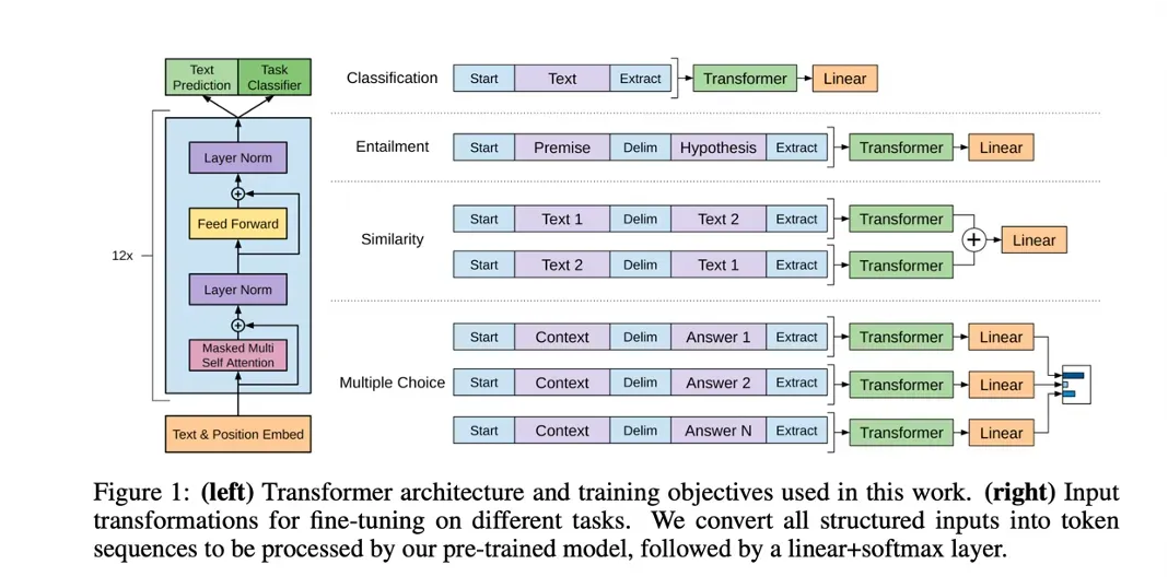 下图为GPT-1模型[3]的基础Transformer结构(左),以及在不同任务下的模型输入构造方式(右)。从图中可以看到其已经可以进行更多的处理任务。
