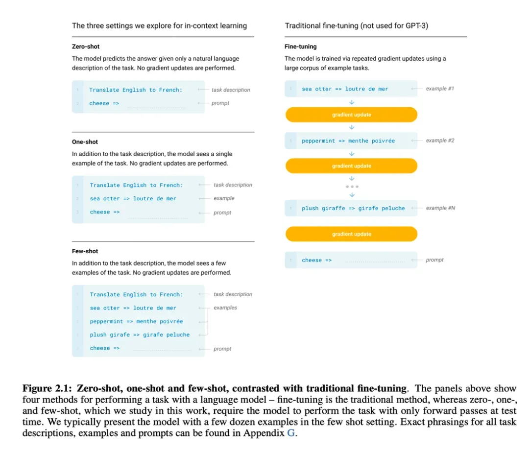 从GPT-2、GPT-3模型,开始采用直接在指令中进行样例学习的方式,以下三种直接在指令中进行的上下文小样本学习方式,而没有采取常规的小样本微调学习方式: