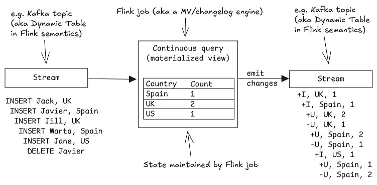 Flink 的核心角色之一是变更日志引擎(基于物化视图的变更)。一个有状态的 Flink 作业会消费一个或多个输入流,维护一个私有物化视图(MV),并将该物化视图的变更作为变更日志(如 Kafka 主题)输出。