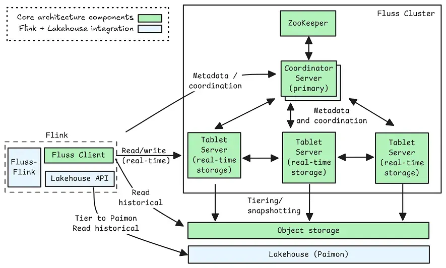 - Fluss 协调器(称为CoordinatorServer, 基于 ZooKeeper)