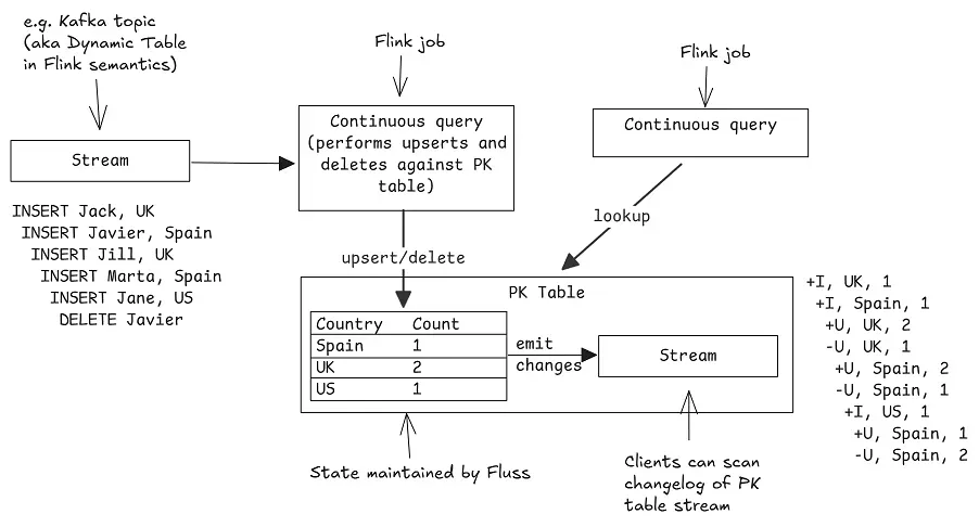 正如我们将在本文中看到的,Fluss 不仅基于 Kafka 构建仅追加表(日志表),还将其用于主键表的变更日志以及主键表的持久化机制。