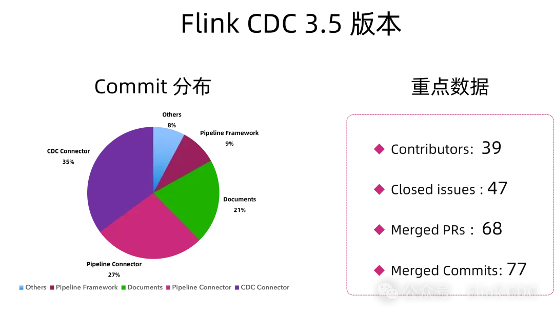 在社区用户和开发者们的共同努力下,Apache Flink 社区很高兴宣布 Flink CDC 的下一个主要版本 3.5.0 已经发布[1],你可以通过官网下载和快速体验[2]。3.5 版本共有 39位社区贡献者参与贡献,累计关闭 47 个 issue,合并了 68 个PR,贡献了 77 个 commits。