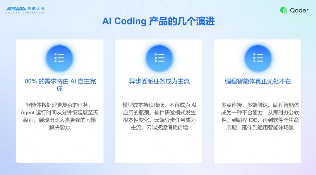 编程智能体真正无处不在。AI 帮助我们实现更多的功能和任务,通过多点、多场景的覆盖,智能体会真正做到无处不在。IDE 不是终局,可能只是一个起点,未来在任何一个工作界面都能够使用编程智能体,去触发和管理一些我们的工作。