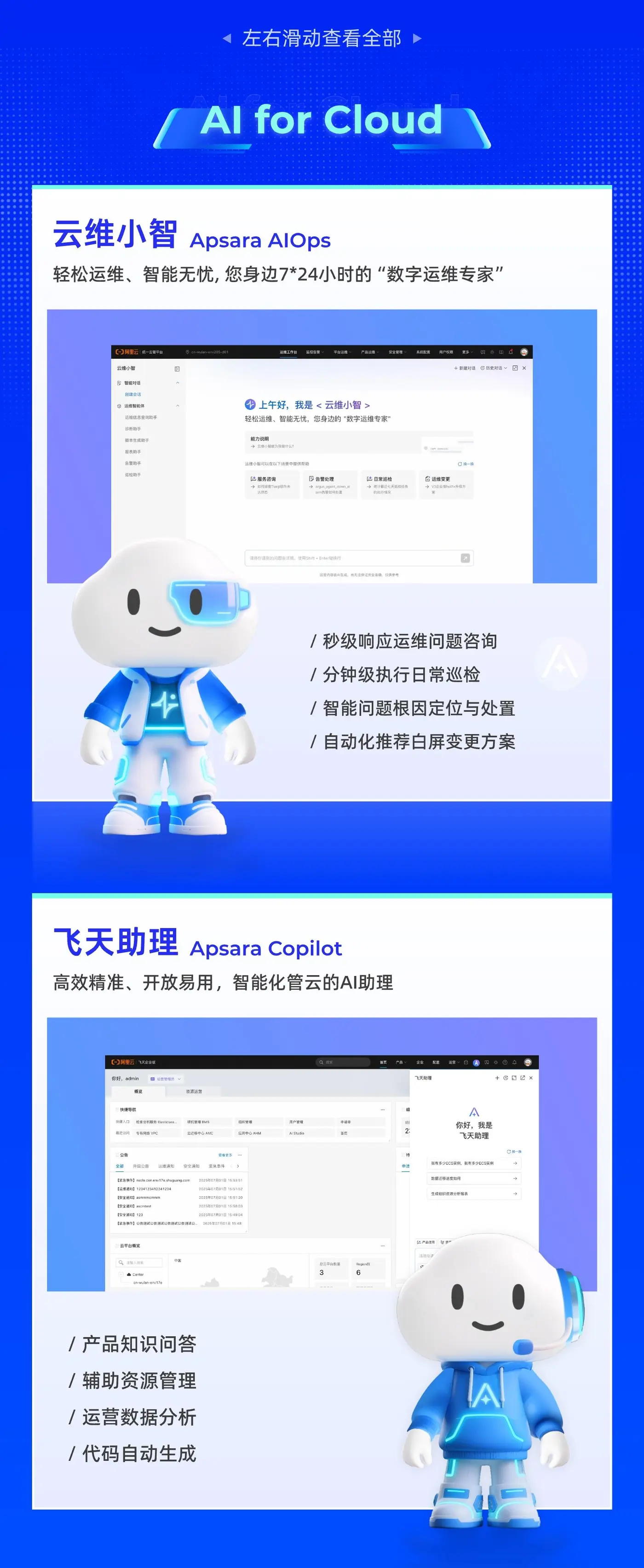 - 在AI for Cloud方面,“云维小智”与“飞天助理”两大AI智能体全面赋能运维与运营。
