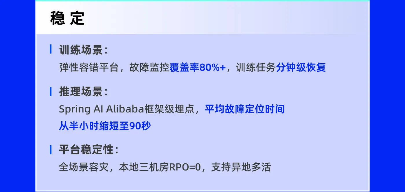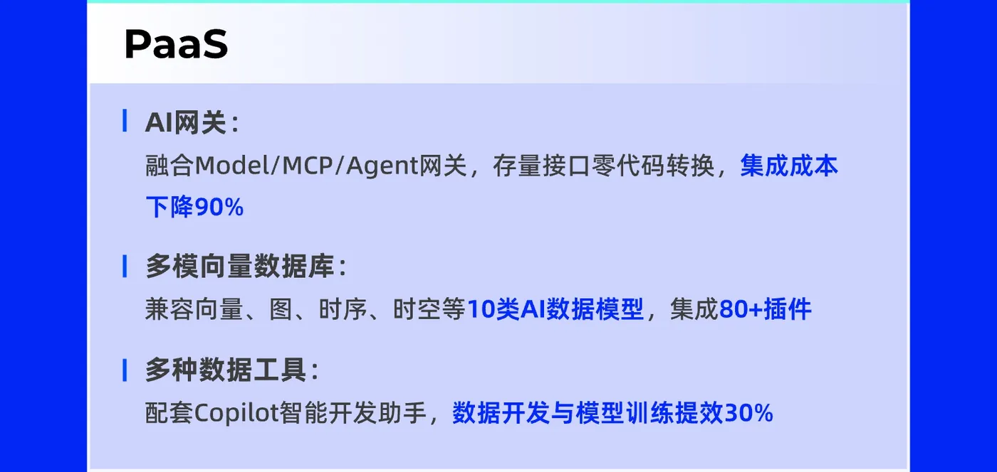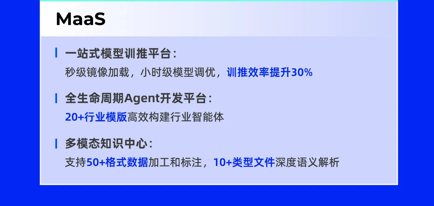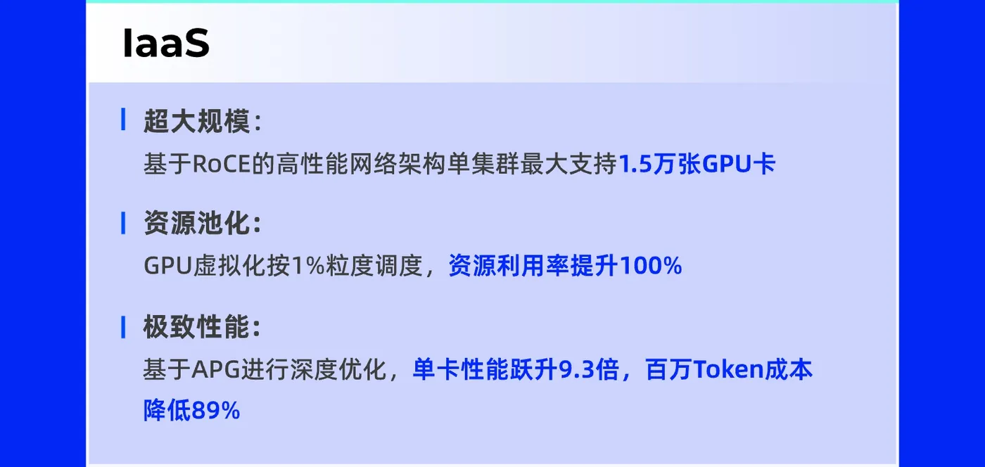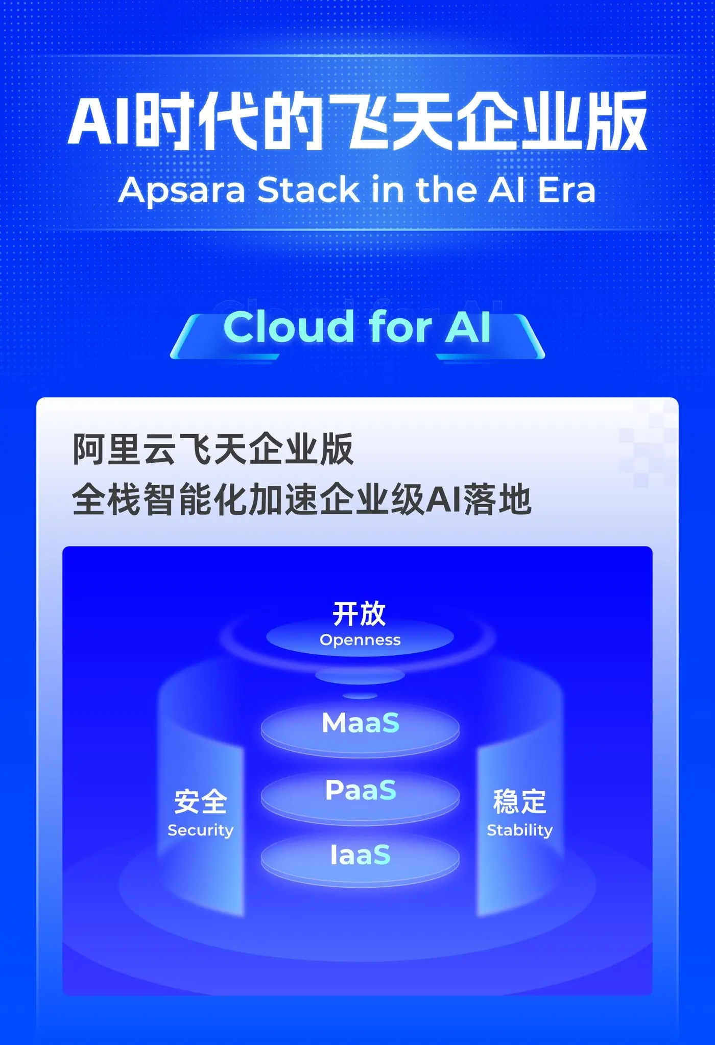 - 在Cloud for AI方面,飞天企业版构建了覆盖IaaS、PaaS、MaaS的全栈AI支撑能力。