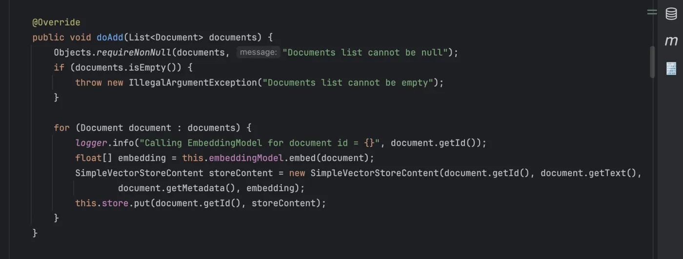 - 使用SimpleVectorStore基于内存存储的向量数据库,根据查看源码,我们可以发现,该数据库在执行add方法时,回调用embeddingModel
