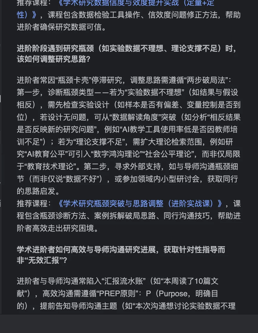 ============message ============ 当你在编写论文时遇到研究瓶颈,比如实验数据不理想或理论支撑不足,可以按照“两步破局法”来有效应对: 1. **诊断瓶颈类型并调整思路**: - **若实验数据不理想**(如结果与假设相反),首先检查实验设计是否存在偏差,例如样本是否具有代表性、变量控制是否严密。如果实验设计合理,不要急于否定结果,而是尝试从新的角度解读数据——“反常结果”可能揭示了更有价值的研究问题。例如,AI教学工具使用率低,可能并非技术本身问题,而是教师培训不足所致,这反而可成为研究的创新点。 - **若理论支撑不足**,建议拓展理论视野,不要局限于本领域常用理论。例如研究“AI教育公平”时,除了教育技术理论,还可引入“数字鸿沟理论”或“社会公平理论”,增强论文的解释力和学术深度。 2. **寻求外部支持**: - 与导师沟通时,避免只说“数据不好”这类笼统表达,应具体说明“哪部分数据不符合预期”“已排除哪些干扰因素”“目前的解释方向是什么”,以便获得有针对性的指导。 - 参加小型学术研讨会或研究组会,通过同行交流获取新视角,有时他人的一句话可能激发你的突破性思路。 此外,推荐你学习《**学术研究瓶颈突破与思路调整(进阶实战课)**》,该课程系统讲解瓶颈诊断方法、真实案例的破局路径以及如何高效与导师沟通,帮助你从“卡壳”走向“突围”。 记住:研究瓶颈不是失败,而是深化思考的契机。关键在于主动分析、开放沟通、灵活调整。 ============message ============