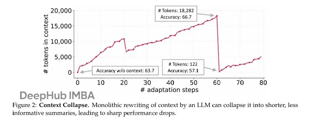 论文在AppWorld benchmark上做了个实验来观察这个现象。当LLM被要求在每个适应步骤完全重写累积的上下文时,上下文会发生崩溃。第60步时上下文有18,282个token,准确率66.7%,但下一步就崩溃到122个token,准确率掉到57.1%——比不适应的baseline 63.7%还差。虽然论文用Dynamic Cheatsheet举例,但这不是那个方法特有的问题,而是用LLM端到端重写上下文的根本风险——累积的知识可能突然被抹掉。