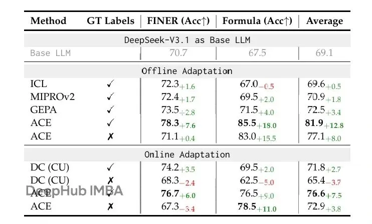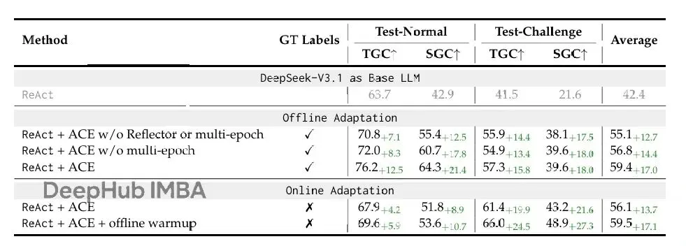 在agent用例里,ACE即使在适应期间没有ground-truth标签也保持有效:这个设置下ReAct + ACE比ReAct baseline平均改进14.8%。这种鲁棒性源于ACE利用执行期间自然可得的信号(比如代码执行成功或失败)来指导Reflector和Curator形成结构化的成功失败教训。