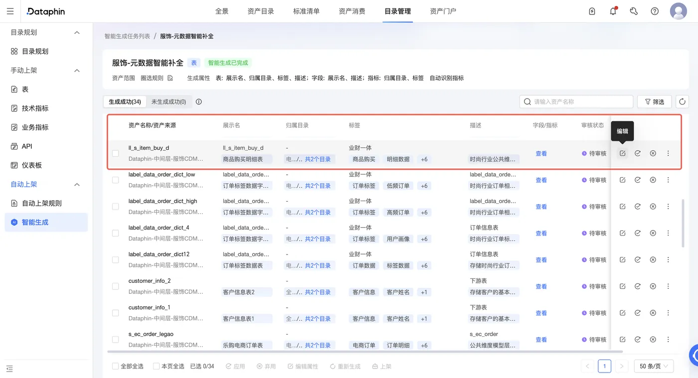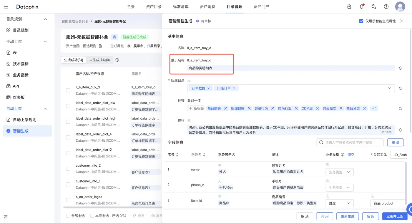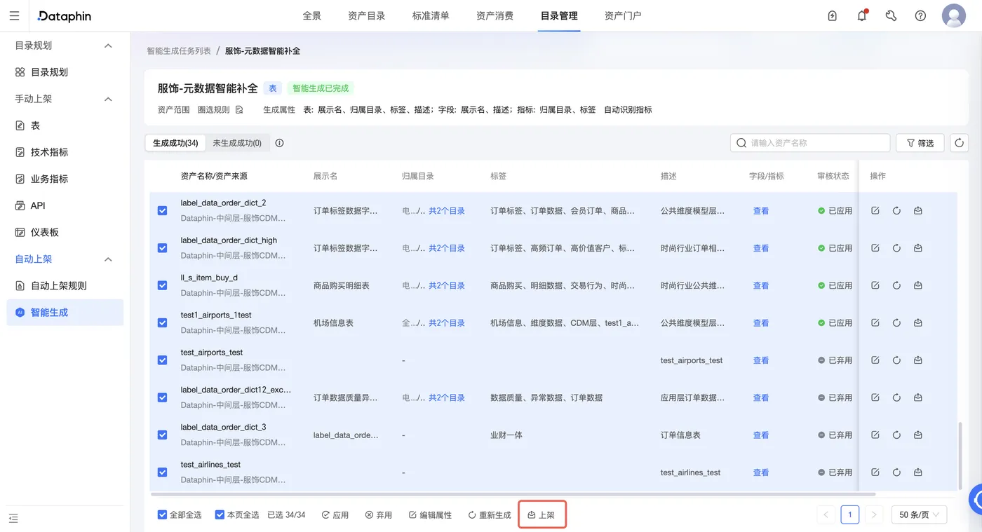针对这类场景,Dataphin推出了「X-数据管家」,支持批量圈选数据资产,借助大模型的能力基于资产元数据信息(表DDL、样例数据等),智能生成标签、描述、字段类型等属性,结合自动上架规则,资产运营人员仅需确认结果,便可一键批量上架,显著提升资产运营效率。