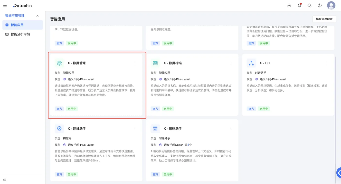前提:确保在智能应用管理中,启用了「X-数据管家」