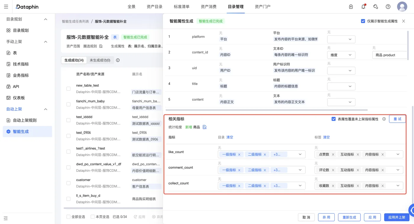 - 接下来,我们在「资产」-「目录管理」-「智能生成」,新建智能生成任务,圈选出需要补全信息的资产,可根据需要选择属性种类。此处的“自动识别指标”若开启,大模型会自动识别出表关联的指标并生成指标基本信息。