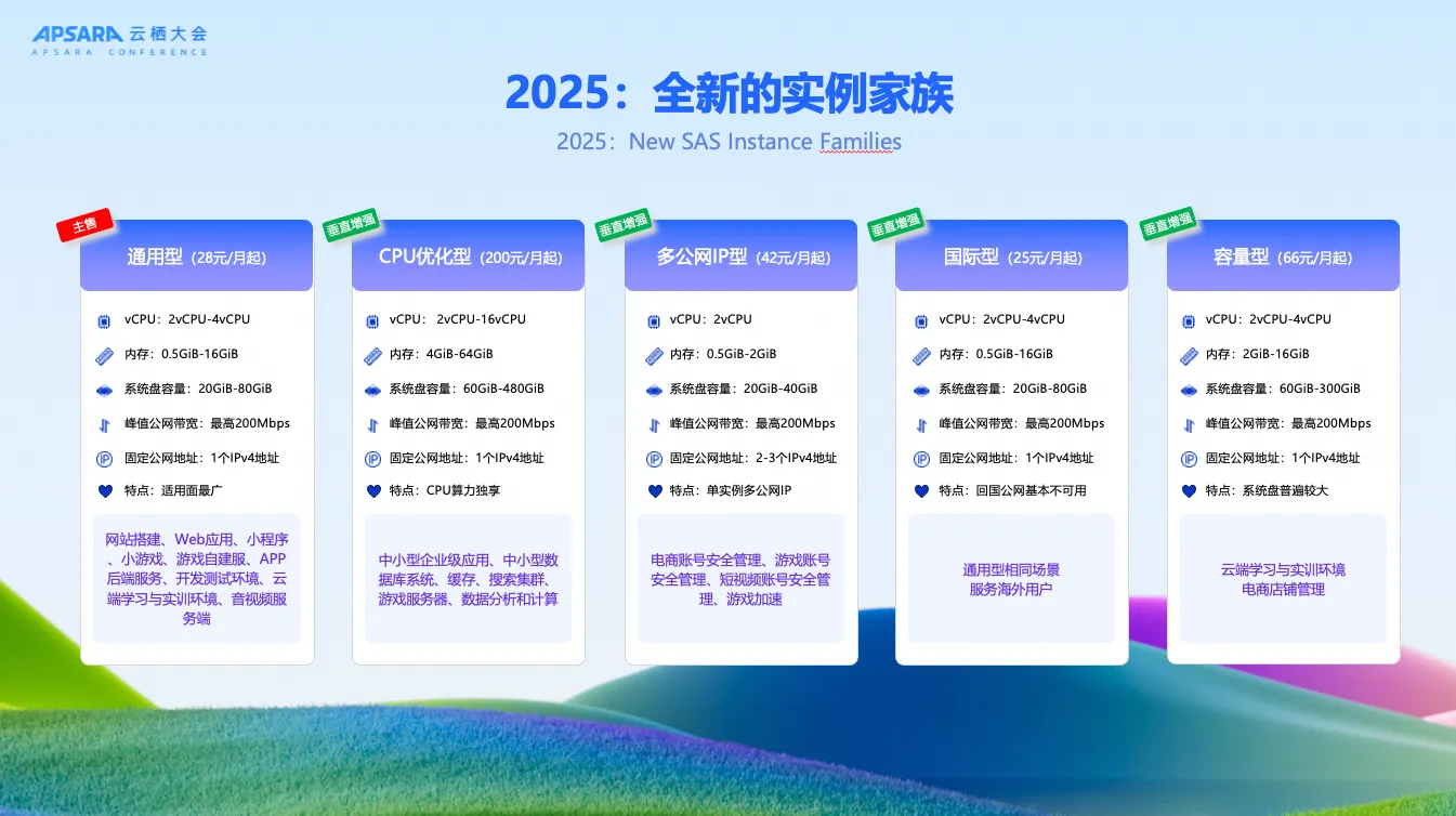 轻量应用服务器(Simple Application Server)是专为中小企业及开发者设计的云服务器产品,预装宝塔、Dify等热门应用软件,以预付费的方式售卖计算、存储、网络套餐,隐藏VPC、弹性网卡等暂时不需要的特性。2025年阿里云带来全新产品序列,通用型低至每月28元,最小规格2c0.5g起步,适合网站、开发测试等场景,是多数客户共同选择的经典产品;CPU优化型低至每月200元,CPU算力独享、最大16vCPU,适合游戏服务器、企业应用与数据库等场景,是企业客户的首选;除此之外,包含多公网IP型、国际型、容量型在内的5款新品还标配200Mbps峰值公网带宽。