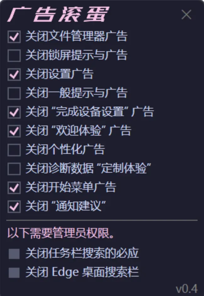 只需以管理员身份运行软件后,将所有选项都勾选,就可以将这些广告都关闭了,非常牛逼!