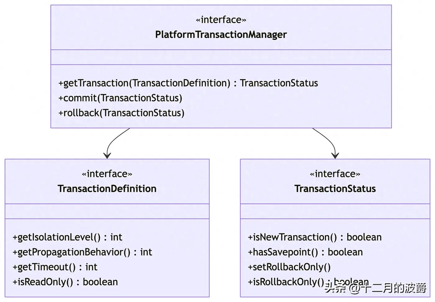 - TransactionDefinition:事务定义信息(隔离级别、传播行为、超时时间等)